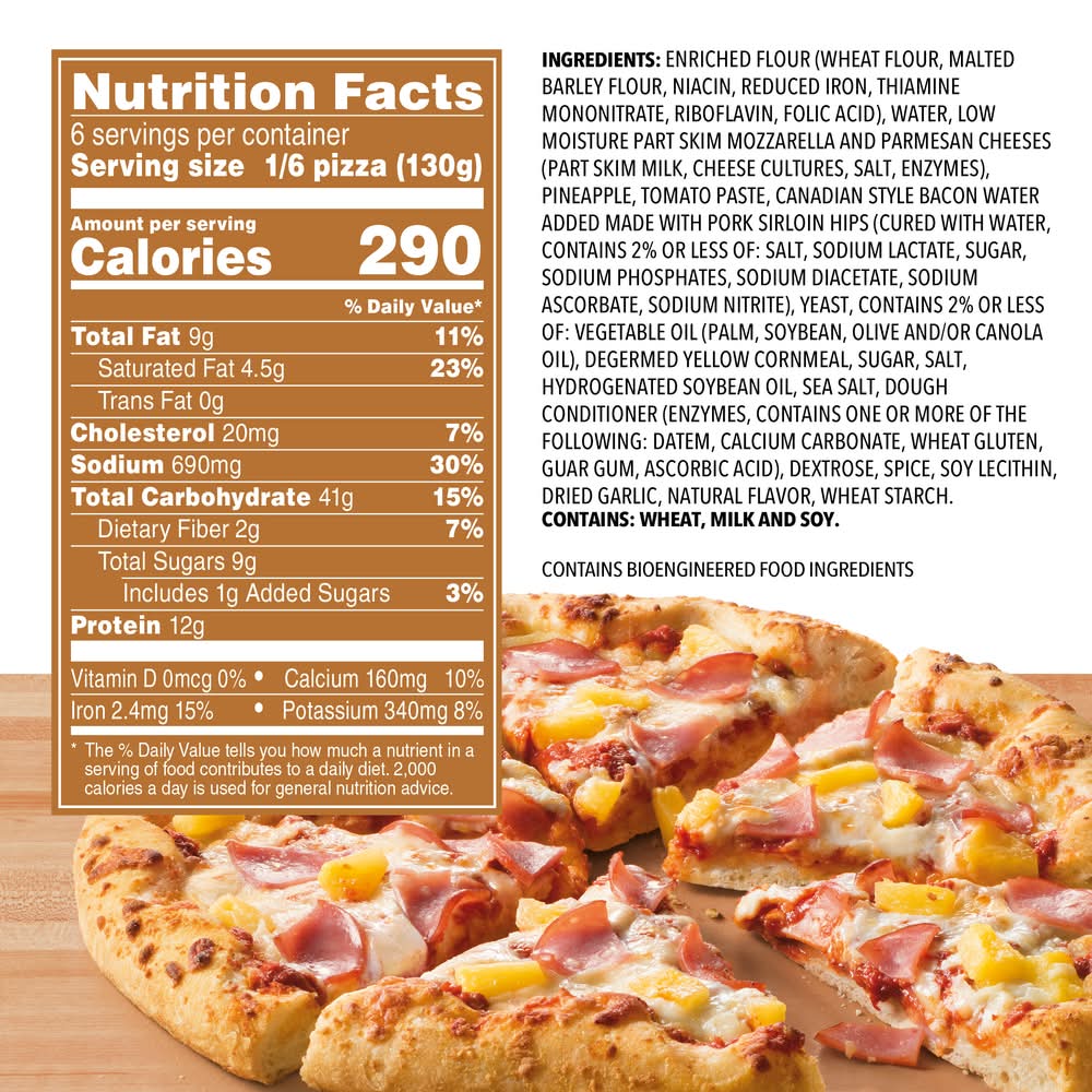 Ingredients: INGREDIENTS: ENRICHED FLOUR (WHEAT FLOUR, MALTED BARLEY FLOUR, NIACIN, REDUCED IRON, THIAMINE MONONITRATE, RIBOFLAVIN, FOLIC ACID), WATER, LOW MOISTURE PART SKIM MOZZARELLA AND PARMESAN CHEESES (PART SKIM MILK, CHEESE CULTURES, SALT, ENZYMES), PINEAPPLE, TOMATO PASTE, CANADIAN STYLE BACON WATER ADDED MADE WITH PORK SIRLOIN HIPS (CURED WITH WATER, CONTAINS 2% OR LESS OF: SALT, SODIUM LACTATE, SUGAR, SODIUM PHOSPHATES, SODIUM DIACETATE, SODIUM ASCORBATE, SODIUM NITRITE), YEAST, CONTAINS 2% OR LESS OF: VEGETABLE OIL (PALM, SOYBEAN, OLIVE AND/OR CANOLA OIL), DEGERMED YELLOW CORNMEAL, SUGAR, SALT, HYDROGENATED SOYBEAN OIL, SEA SALT, DOUGH CONDITIONER (ENZYMES, CONTAINS ONE OR MORE OF THE FOLLOWING: DATEM, CALCIUM CARBONATE, WHEAT GLUTEN, GUAR GUM, ASCORBIC ACID), DEXTROSE, SPICE, SOY LECITHIN, DRIED GARLIC, NATURAL FLAVOR, WHEAT STARCH. Contains: Milk, Wheat, Soy