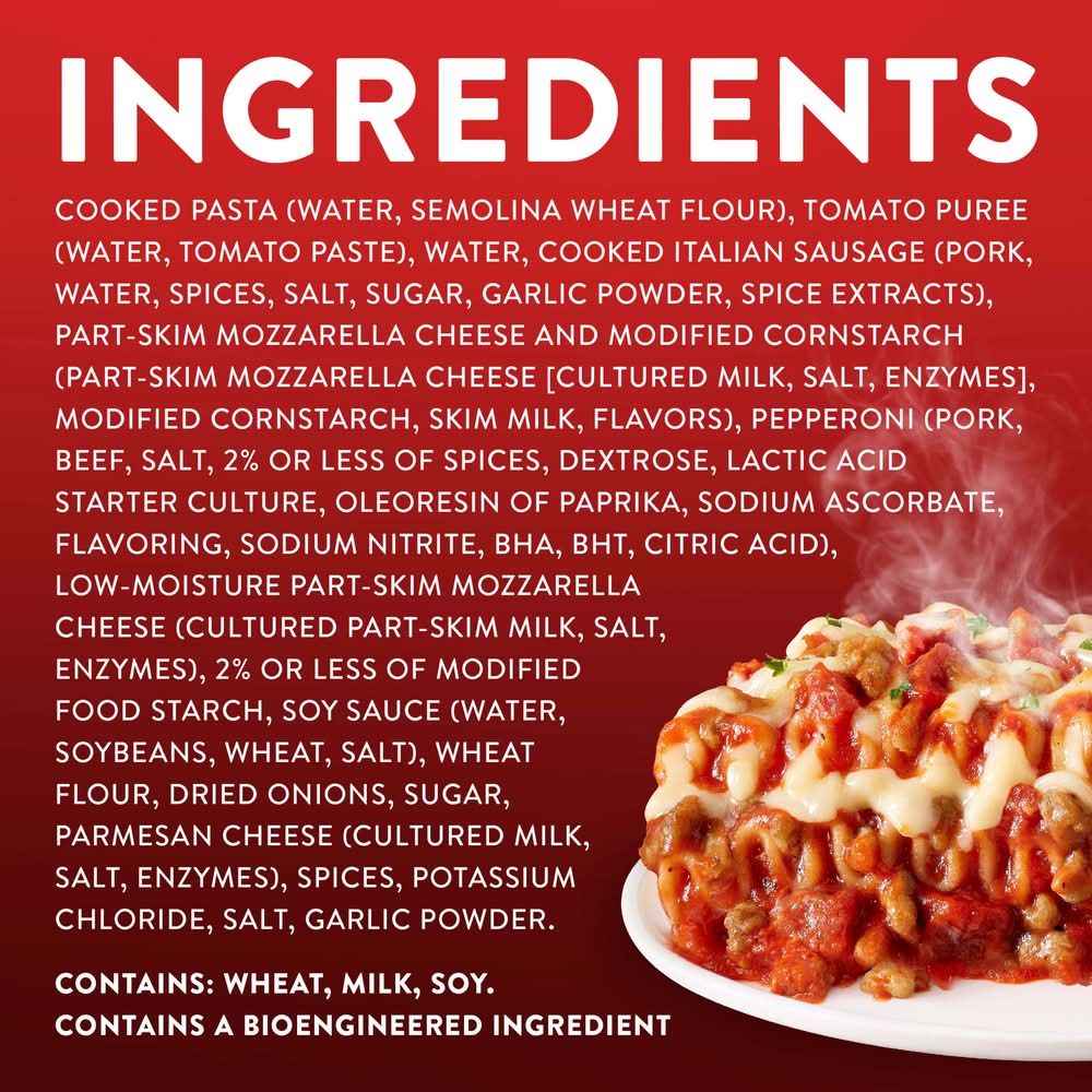 Ingredients: COOKED PASTA (WATER, SEMOLINA WHEAT FLOUR), TOMATO PUREE (WATER, TOMATO PASTE), WATER, COOKED ITALIAN SAUSAGE (PORK, WATER, SPICES, SALT, SUGAR, GARLIC POWDER, SPICE EXTRACTS), PART-SKIM MOZZARELLA CHEESE AND MODIFIED CORNSTARCH (PART-SKIM MOZZARELLA CHEESE [CULTURED MILK, SALT, ENZYMES], MODIFIED CORNSTARCH, SKIM MILK, FLAVORS), PEPPERONI (PORK, BEEF, SALT, 2% OR LESS OF SPICES, DEXTROSE, LACTIC ACID STARTER CULTURE, OLEORESIN OF PAPRIKA, SODIUM ASCORBATE, FLAVORING, SODIUM NITRITE, BHA, BHT, CITRIC ACID), LOW-MOISTURE PART-SKIM MOZZARELLA CHEESE (CULTURED PART-SKIM MILK, SALT, ENZYMES), 2% OR LESS OF MODIFIED FOOD STARCH, SOY SAUCE (WATER, SOYBEANS, WHEAT, SALT), WHEAT FLOUR, DRIED ONIONS, SUGAR, PARMESAN CHEESE (CULTURED MILK, SALT, ENZYMES), SPICES, POTASSIUM CHLORIDE, SALT, GARLIC POWDER. Contains: Wheat, Milk, Soy