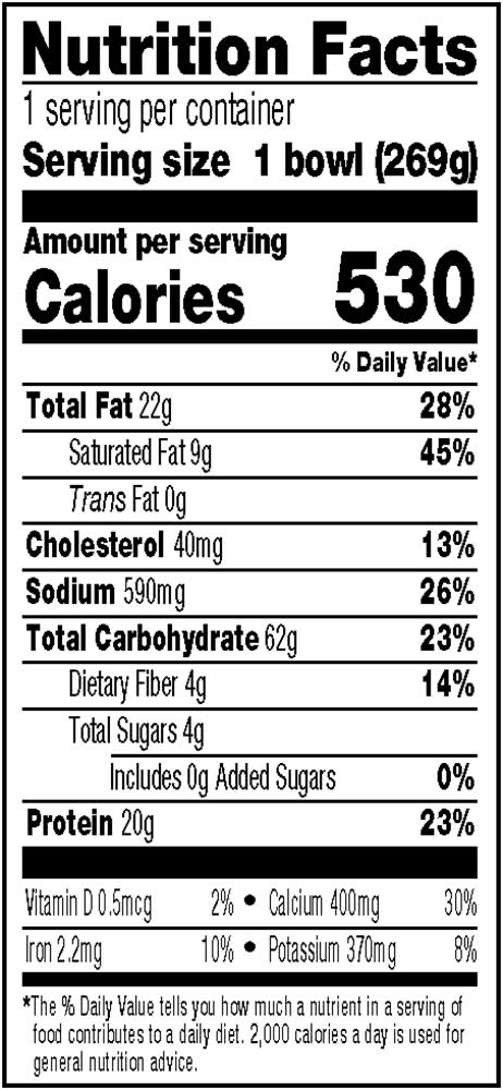 Directions for use: Toaster Oven: Remove overwrap and bowl. Place in an oven-safe dish. Follow conventional oven directions. Microwave or regular oven. Microwave: Directions: Ovens may vary. Microwave Oven: Make a 1-inch slit in overwrap. Cook on high for 3 minutes. Remove overwrap. Stir. Cook on high for 1 minute. Let sit 1 minute. Serve. Bake: Conventional Oven: Preheat oven to 375 degrees F. Remove overwrap. Cover bowl with foil and place on a baking sheet. Bake for 45 minutes. Remove foil. Bake for 5-10 more minutes. Let sit 1 minute. Serve. Toaster Oven: Remove overwrap and bowl. Place in an oven-safe dish. Follow conventional oven directions. Perishable. Keep frozen. Storage recommendation: Perishable. Keep frozen.