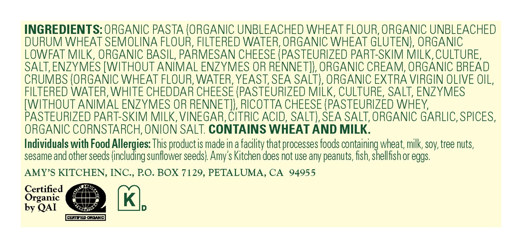 Ingredients: ORGANIC PASTA (ORGANIC UNBLEACHED WHEAT FLOUR, ORGANIC UNBLEACHED DURUM WHEAT SEMOLINA FLOUR, FILTERED WATER, ORGANIC WHEAT GLUTEN), ORGANIC LOWFAT MILK, ORGANIC BASIL, PARMESAN CHEESE (PASTEURIZED PART-SKIM MILK, CULTURE, SALT, ENZYMES [WITHOUT ANIMAL ENZYMES OR RENNET]), ORGANIC CREAM, BREAD CRUMBS (ORGANIC WHEAT FLOUR, WATER, YEAST SEA SALT), ORGANIC EXTRA VIRGIN OLIVE OIL, FILTERED WATER, WHITE CHEDDAR CHEESE (PASTEURIZED MILK, CULTURE, SALT, ENZYMES[WITHOUT ANIMAL ENZYMES OR RENNET]), RICOTTA CHEESE (PASTEURIZED WHEY, PASTEURIZED PART-SKIM MILK, VINEGAR, CITRIC ACID, SALT), SEA SALT, ORGANIC GARLIC, SPICES, ORGANIC CORNSTARCH, ONION SALT.CONTAINS WHEAT AND MILK. Contains: Wheat, Milk, Gluten, Soybeans, Tree Nuts