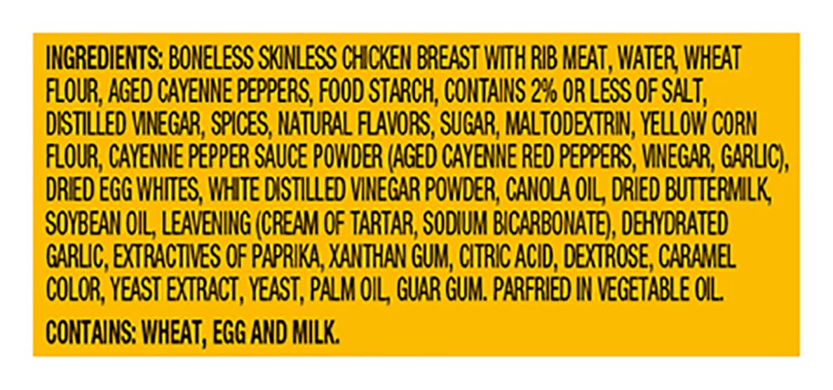 Ingredients: Boneless Skinless Chicken Breast with Rib Meat, Water, Wheat Flour, Aged Cayenne Peppers, Food Starch, Contains 2% or Less of Salt, Distilled Vinegar, Spices, Natural Flavors, Sugar, Maltodextrin, Yellow Corn Flour, Cayenne Pepper Sauce Powder (Aged Cayenne Red Peppers, Vinegar, Garlic), Dried Egg Whites, White Distilled Vinegar Powder, Canola Oil, Dried Buttermilk, Soybean Oil, Leavening (Cream of Tartar, Sodium Bicarbonate), Dehydrated Garlic, Extractives of Paprika, Xanthan Gum, Citric Acid, Dextrose, Caramel Color, Yeast Extract, Yeast, Palm Oil, Guar Gum, Parfried in Vegetable Oil Contains: Wheat, Milk, Eggs, Corn