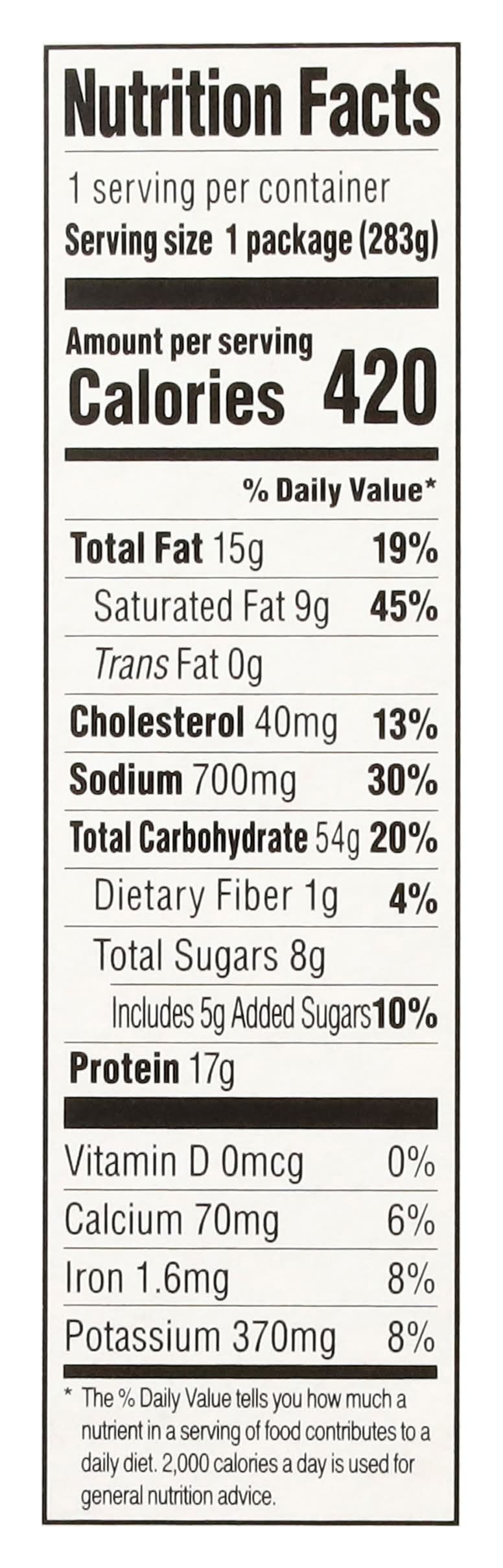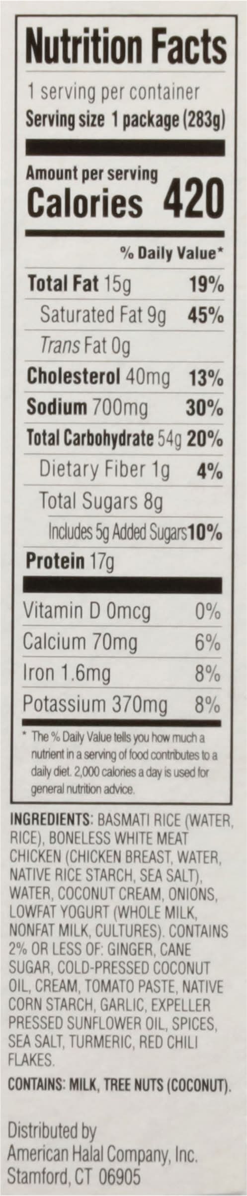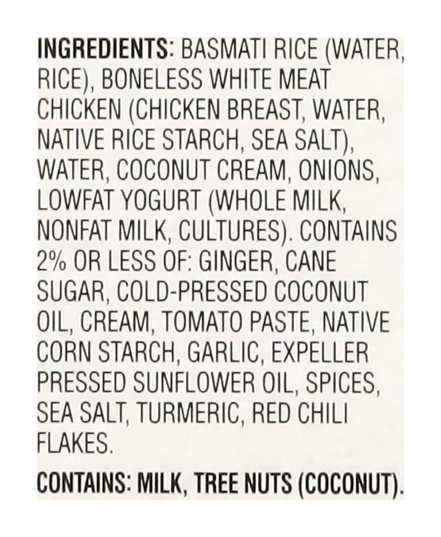 Ingredients: Basmati Rice (Water, Rice), Boneless White Meat Chicken (Chicken Breast, Water, Native Rice Starch, Sea Salt), Water, Coconut Cream, Onions, Lowfat Yogurt (Whole Milk, Nonfat Milk, Cultures), Contains 2% or Less of: Ginger, Cane Sugar, Cold-Pressed Coconut Oil, Cream, Tomato Paste, Native Corn Starch, Garlic, Expeller Pressed Sunflower Oil, Spices, Sea Salt, Turmeric, Red Chili Flakes Contains: Milk, Tree Nuts, Coconuts, Corn