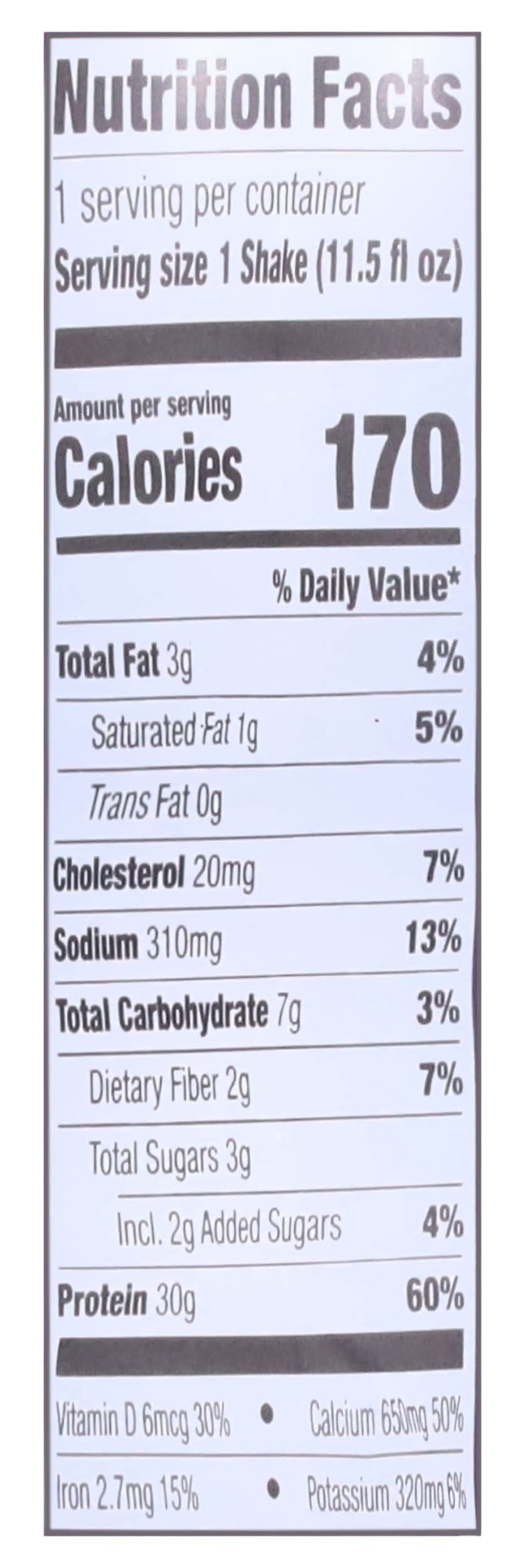 Ingredients: Water, Milk Protein Concentrate(a), Calcium Caseinate(a), Cocoa Powder (Processed with Alkal), Contains Less than 1% of Sugar, Sunflower Oil or Soybean Oil Natural and Artificial Flavor, Cellulose Gel and Cellulose Gum, Salt, Sucralose, Acesulfame Potassium, Carrageenan, Tripotassium Phosphate Dipotassium Phosphate-Sodium Hexametaphosphate Vitamin and Mineral Blend (DL-Alpha-Tocopheryl Acetate [Vitamin E], Zinc Glycinate Chelate, Ferric Orthophosphate, Vitamin A Palmitate, Niacinamide, Phytonadione [Vitamin K1], Potassium Iodide, Cholecalciferol [Vitamin D3] Copper Gluconate Calcium D-Pantothenate, Manganese Sulfate, Sodium Selenite Biotin, Sodium Molybdate, Folic Acid, Thiamine Mononitrate [Vitamin B1], Cyanocobalamin [Vitamin B12], Pyridoxine Hydrochloride [Vitamin B6], Riboflavin [Vitamin B2], Chromium Polynicotinate), Magnesium Phosphate. (a) Source of Protein Contains: Milk, Soybeans