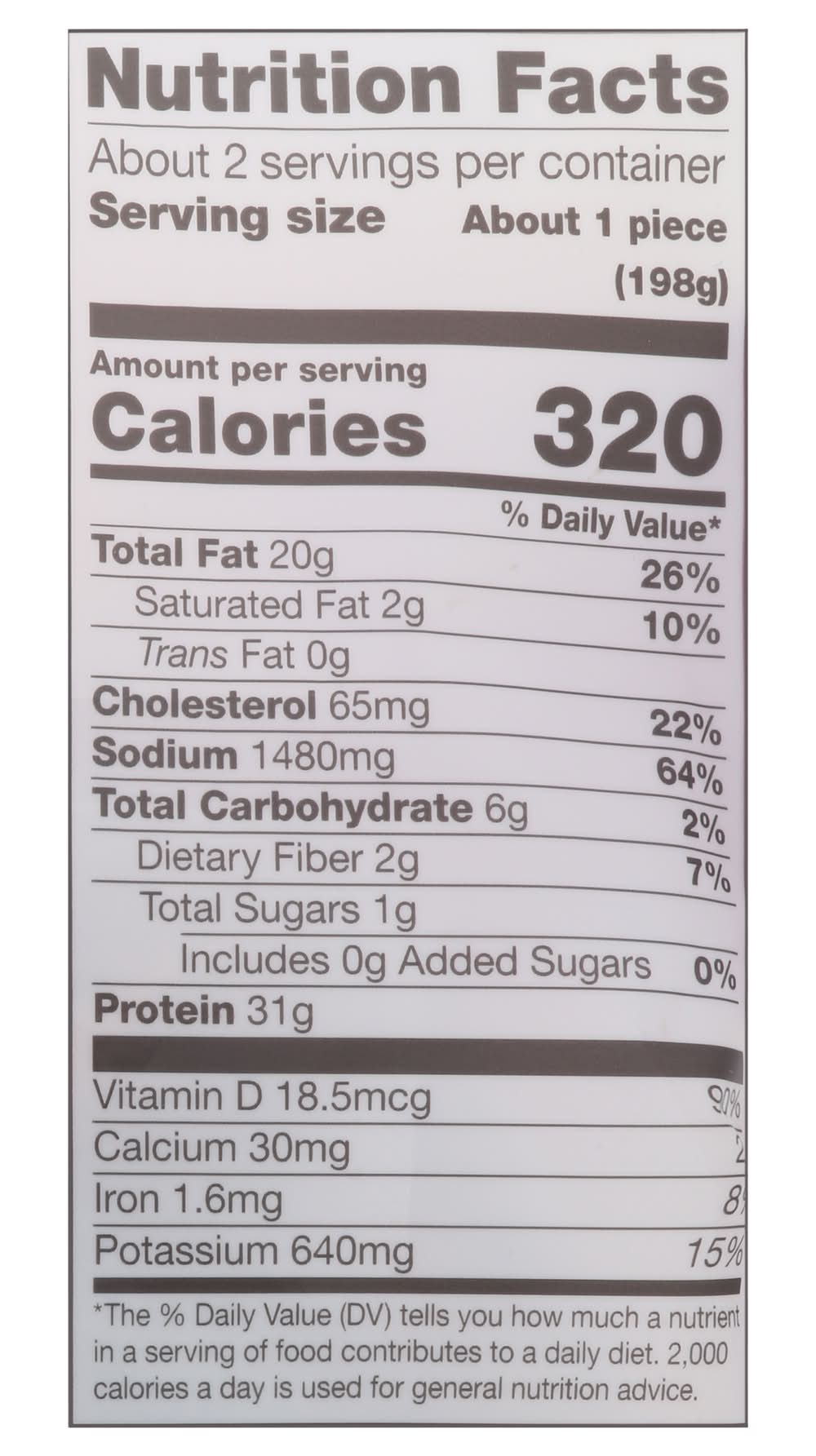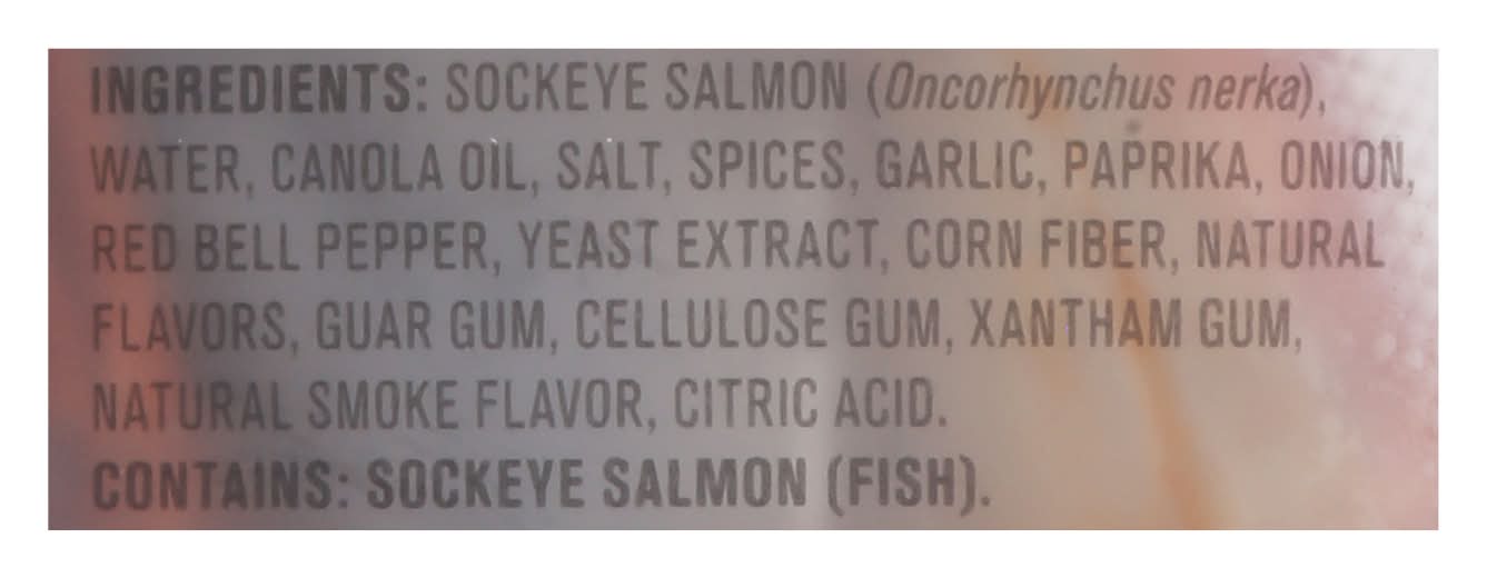 Ingredients: Sockeye Salmon (Oncorhynchus Nerka), Water, Canola Oil, Salt, Spices, Garlic, Paprika, Onion, Red Bell Pepper, Yeast Extract, Corn Fiber, Natural Flavors, Guar Gum, Cellulose Gum, Xanthan Gum, Natural Smoke Flavor, Citric Acid Contains: Fish, Salmon, Corn
