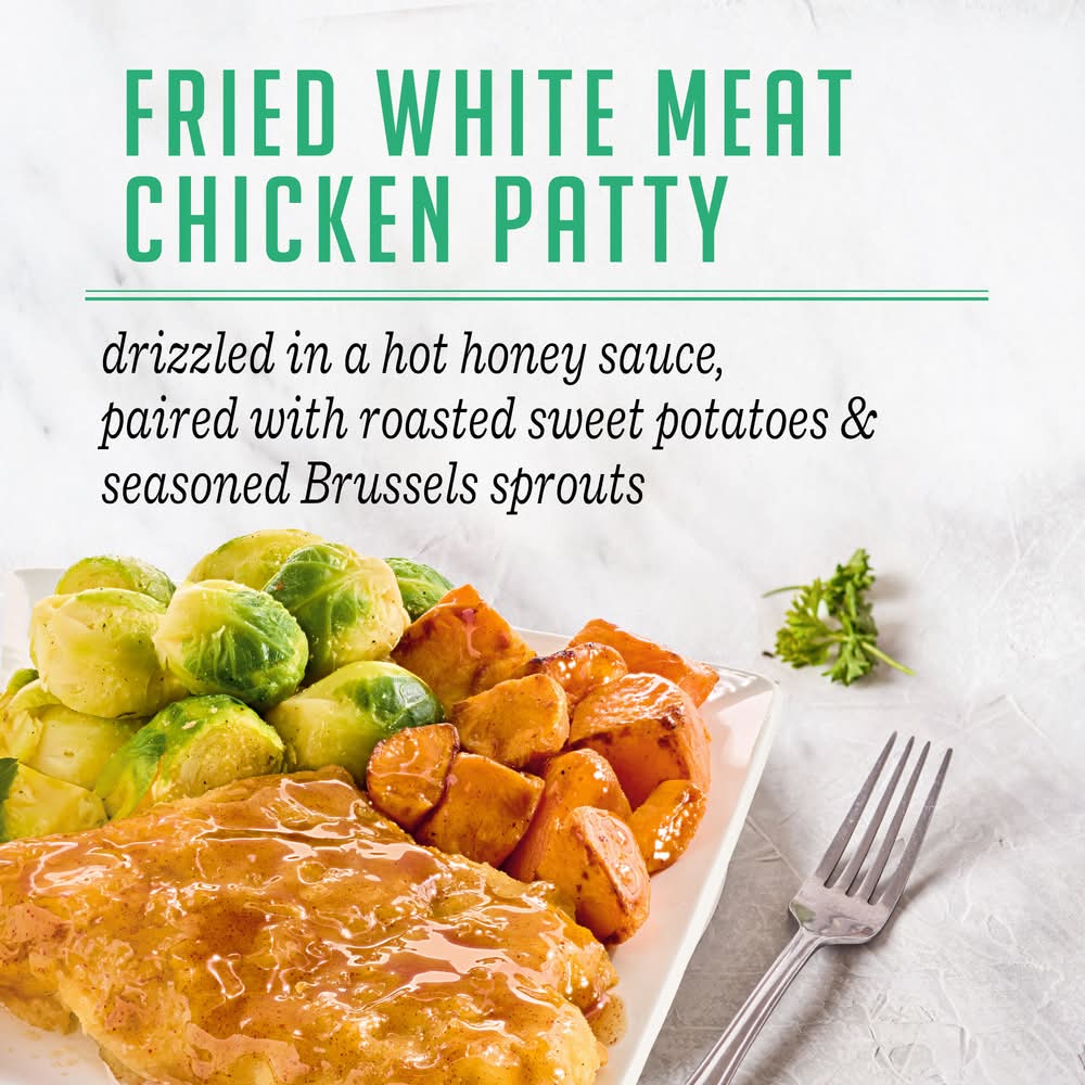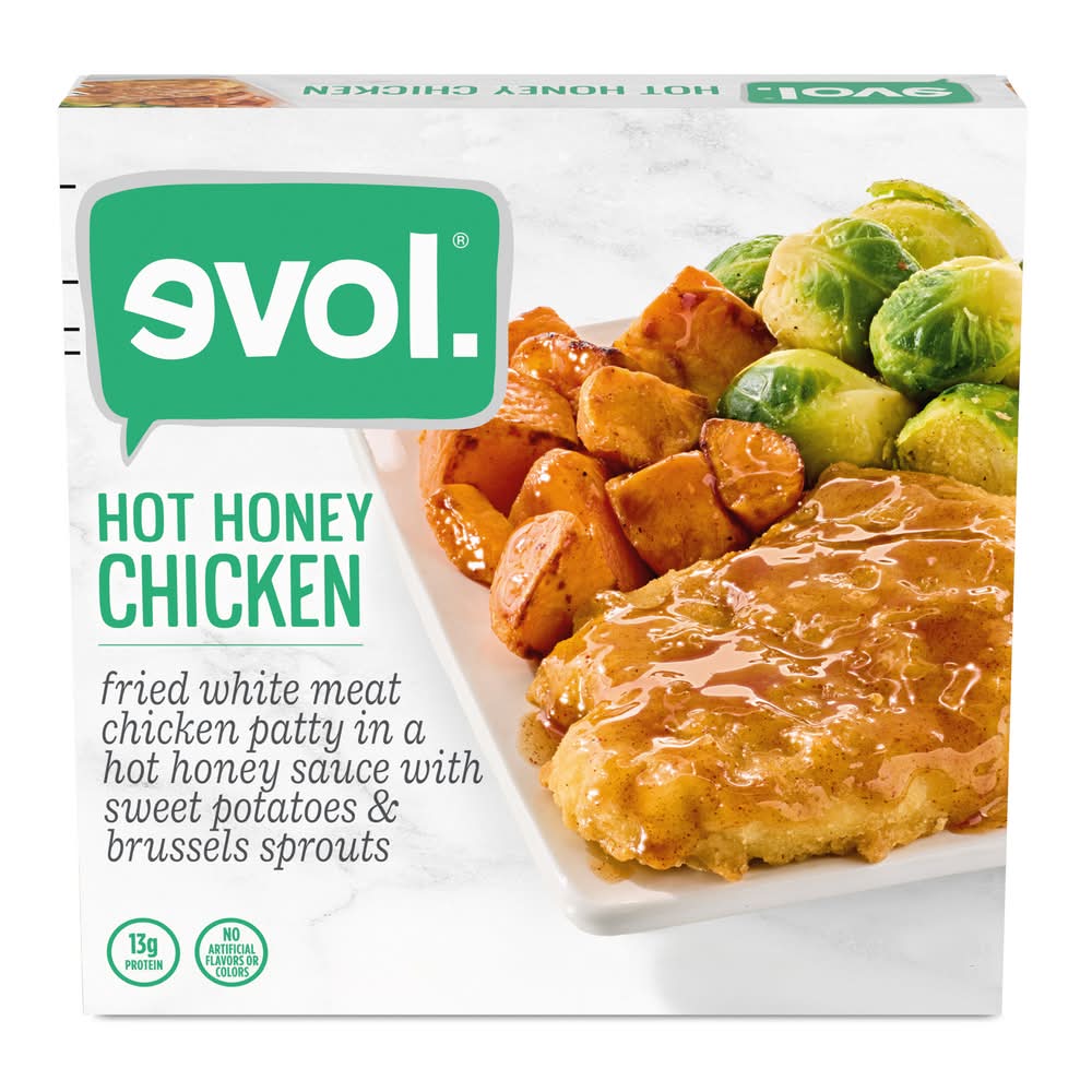 Enjoy restaurant-inspired meals any night of the week in the comfort of your own home with Evol Hot Honey Chicken. This frozen meal is easy to prepare and crafted with quality ingredients like fried white meat chicken drizzled in a sweet and spicy hot honey sauce with sweet potatoes and Brussels sprouts to give you an elevated microwave meal that's worth smiling about. Make quality ready-made meals easy with this hot and spicy chicken ready from freezer to table in just a few simple steps. Dine confidently knowing this frozen meal is made with chicken raised without antibiotics and contains no artificial flavors or colors. Plus, this convenient and flavorful frozen chicken meal has 11 g of protein per serving. Our food philosophy: Love what you eat.