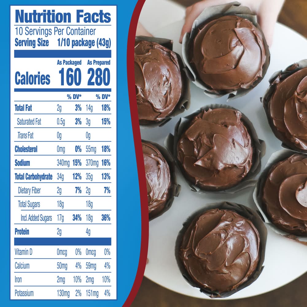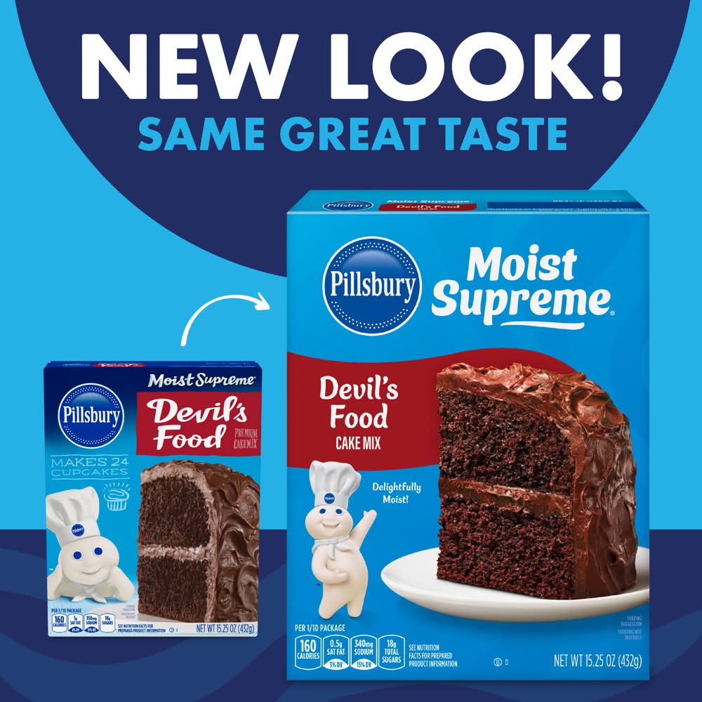 Pillsbury Moist Supreme Devil's Food Premium Cake Mix is designed to create 24 cupcakes with a rich devil's food flavor. Each serving from a tenth of the package contains 160 calories, 1 gram of saturated fat, 350 milligrams of sodium, and 18 grams of sugars. The mix includes a bioengineered food ingredient and comes in packaging made with 35% recycled fiber. Customers are encouraged to review the nutrition facts for prepared product information. • Hometown Food Company, 500 W. Madison, Chicago, IL, 60661 • Packaging: Reusable