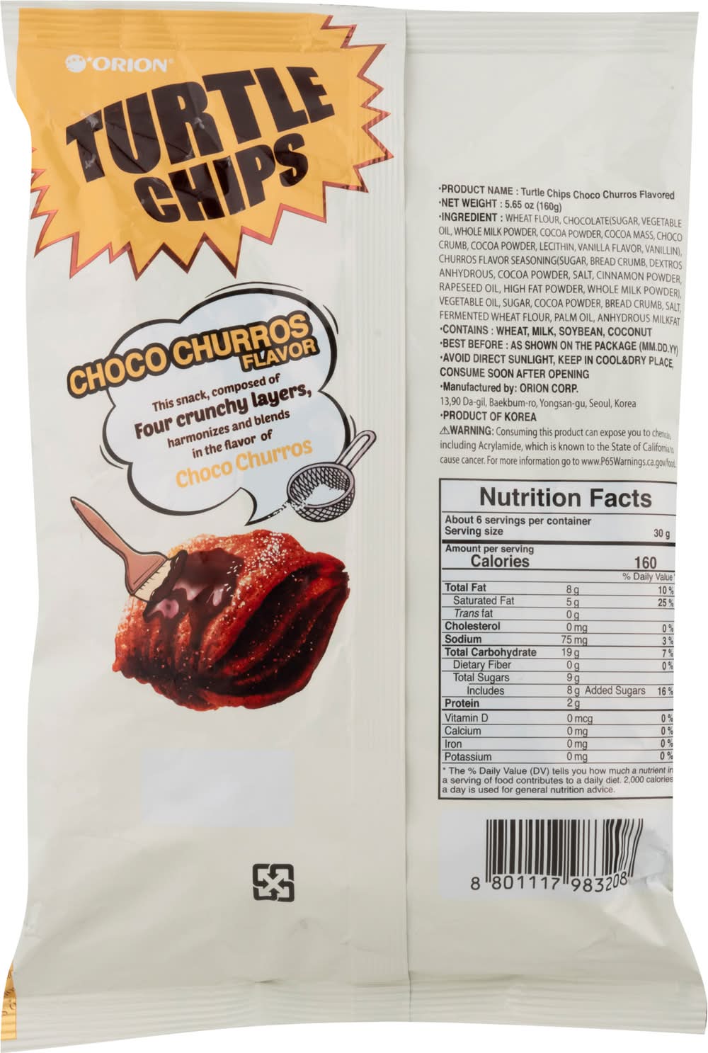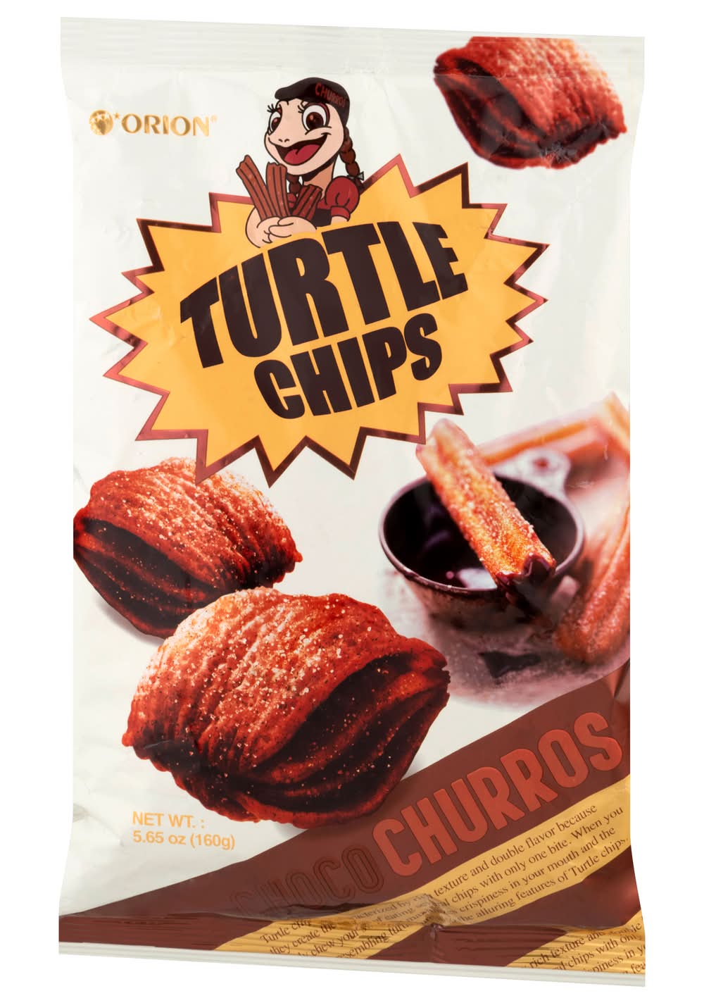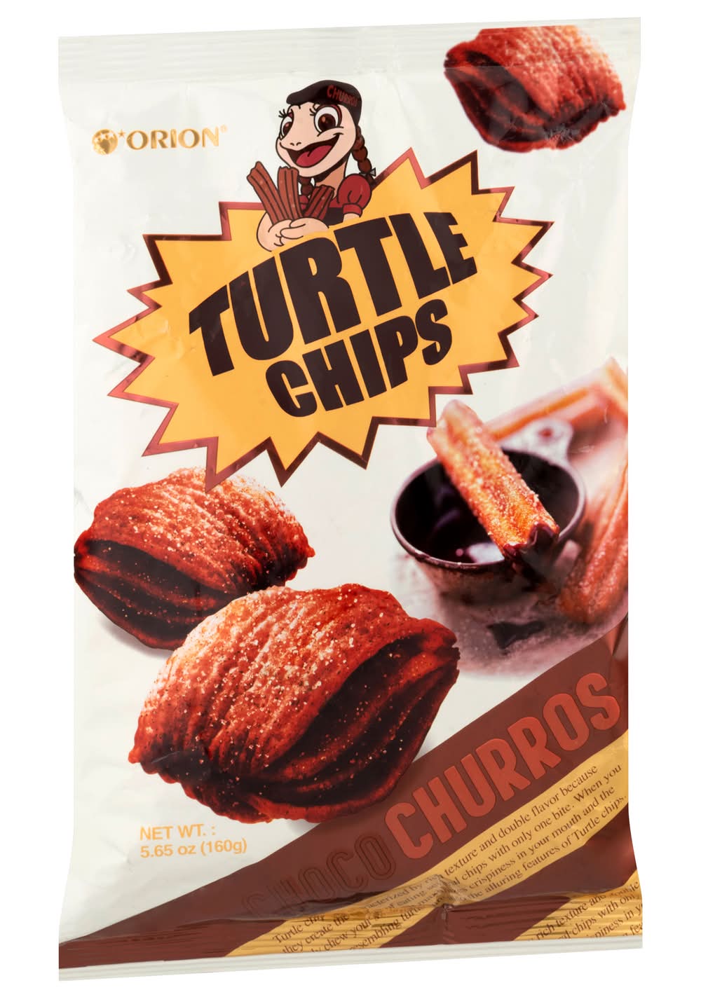 Turtle chips are characterized by rich texture and double flavor because they create the feeling of eating several chips with only one bite. When you slowly chew your sweets, it maximizes crispiness in your mouth and the resembling turtles are also the alluring features of Turtle chips. Choco Churros Flavor: This snack, composed of four crunchy layers, harmonizes and blends • Flavor: Choco churros • Number of servings: 5