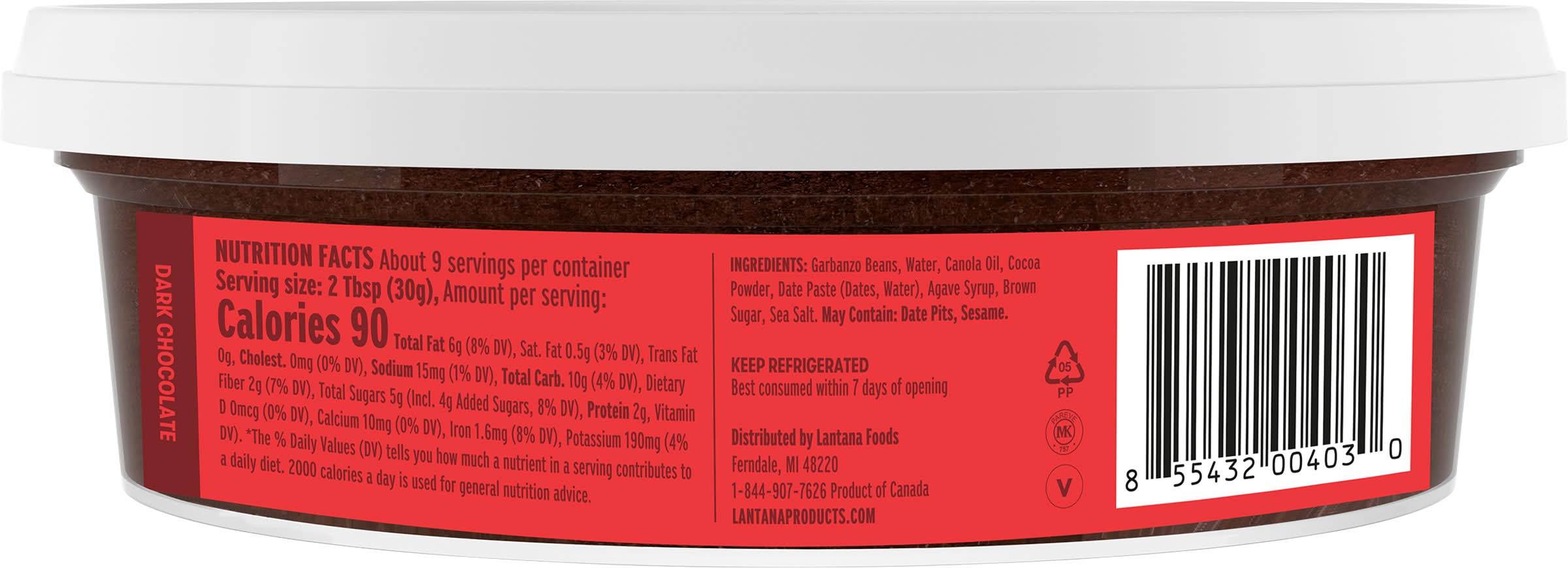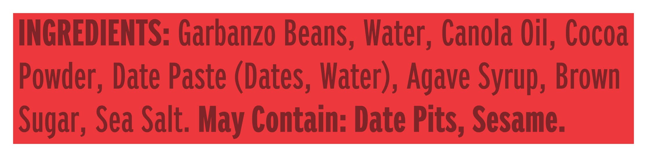 Ingredients: Garbanzo Beans Water Canola Oil Cocoa Powder Date Paste (Dates, Water) Agave Syrup Brown Sugar Chocolate Chips (Unsweetened Chocolate, Cocoa Butter) Sea Salt Potassium Sorbate (to Maintain Freshness). Contains: Sesame