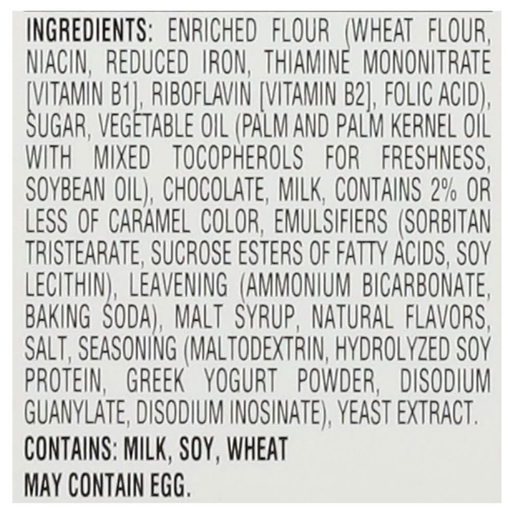 Ingredients: Enriched Flour (Wheat Flour, Niacin, Reduced Iron, Thiamine Mononitrate [Vitamin B1], Riboflavin [Vitamin B2], Folic Acid), Sugar, Vegetable Oil (Palm and Palm Kernel Oil with Mixed Tocopherols for Freshness, Soybean Oil), Chocolate, Milk, Contains 2% or Less of Caramel Color, Emulsifiers (Sorbitan Tristearate, Sucrose Esters of Fatty Acids, Soy Lecithin), Leavening (Ammonium Bicarbonate, Baking Soda), Malt Syrup, Natural Flavors, Salt, Seasoning (Maltodextrin, Hydrolyzed Soy Protein, Greek Yogurt Powder, Disodium Guanylate, Disodium Inosinate), Yeast Extract