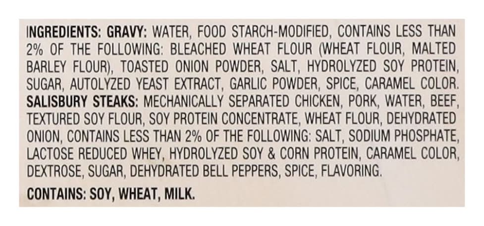 Ingredients: Gravy: Water, Food Starch-Modified, Contains Less than 2% of the Following: Bleached Wheat Flour (Wheat Flour, Malted Barley Flour), Toasted Onion Powder, Salt, Hydrolyzed Soy Protein, Sugar, Autolyzed Yeast Extract, Garlic Powder, Spice, Caramel Color. Salisbury Steaks: Mechanically Separated Chicken, Pork, Water, Beef, Textured Soy Flour, Soy Protein Concentrate, Wheat Flour, Dehydrated Onion, Contains Less than 2% of the Following: Salt, Sodium Phosphate, Lactose Reduced Whey, Hydrolyzed Soy & Corn Protein, Caramel Color, Dextrose, Sugar, Dehydrated Bell Peppers, Spice, Flavoring Contains: Soybeans, Wheat, Milk, Barley, Lactose, Corn