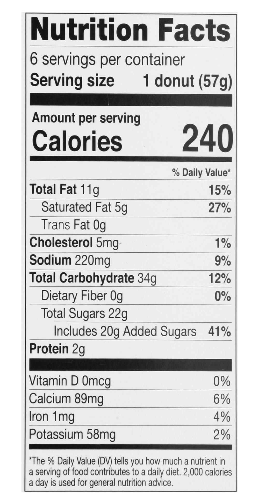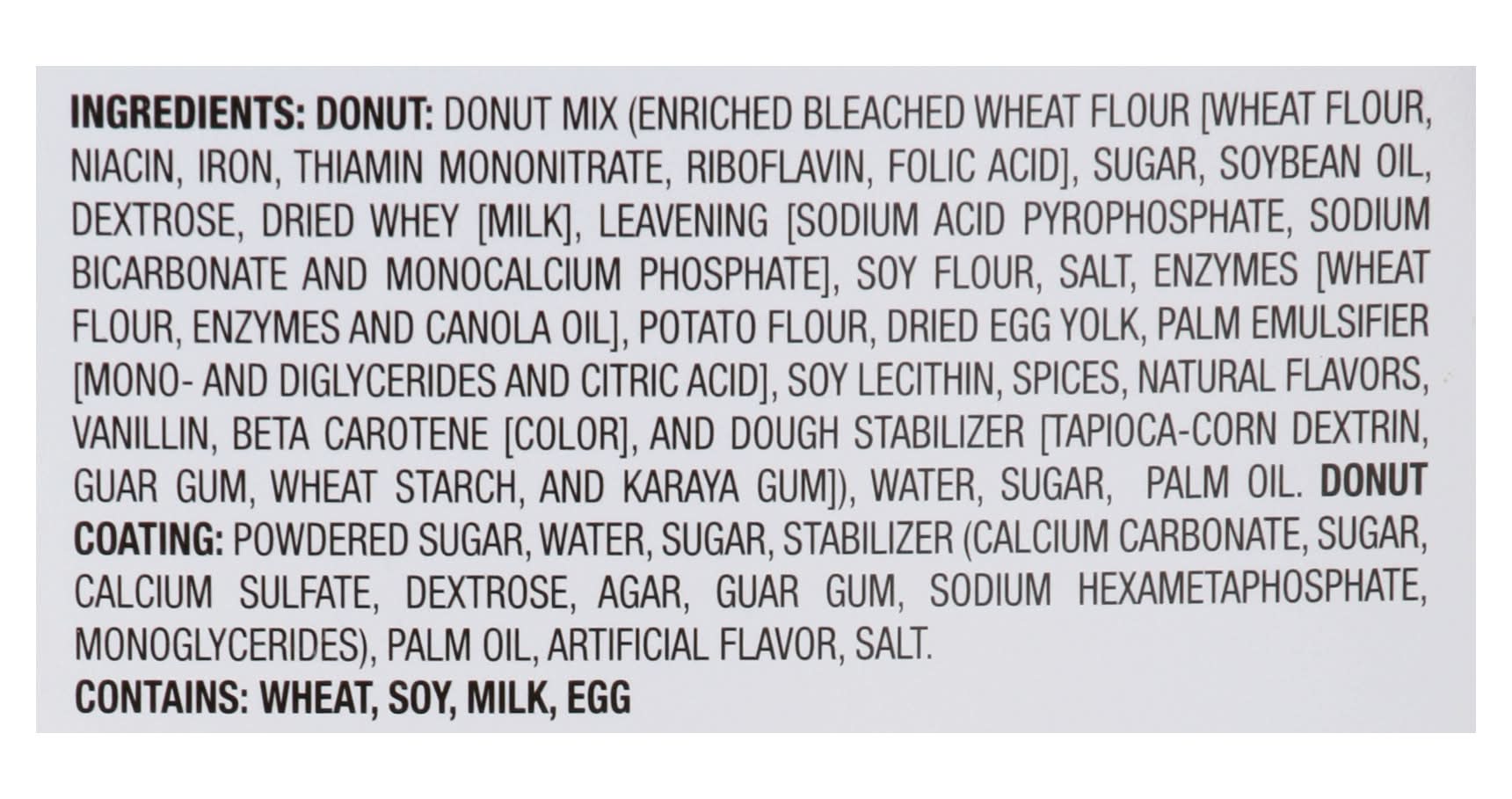 Ingredients: Donut: Donut Mix (Enriched Bleached Wheat Flour [Wheat Flour Niacin Iron Thiamin Mononitrate Riboflavin Folic Acid] Sugar Soybean Oil Dextrose Dried Whey [Milk] Leavening [Sodium Acid Pyrophosphate Sodium Bicarbonate and Monocalcium Phosphate] Soy Flour Salt Enzymes [Wheat Flour Enzymes and Canola Oil] Potato Flour Dried Egg Yolk Palm Emulsifier [Mono- and Diglycerides and Citric Acid] Soy Lecithi, Water, Sugar, Palm Oil. Donut Coating: Powdered Sugar, Water, Sugar, Stabilizer (Calcium Carbonate Sugar Calcium Sulfate Dextrose Agar Guar Gum Sodium Hexametaphosphate Monoglycerides), Palm Oil, Artificial Flavor, Salt Contains: Wheat, Soybeans, Milk, Eggs