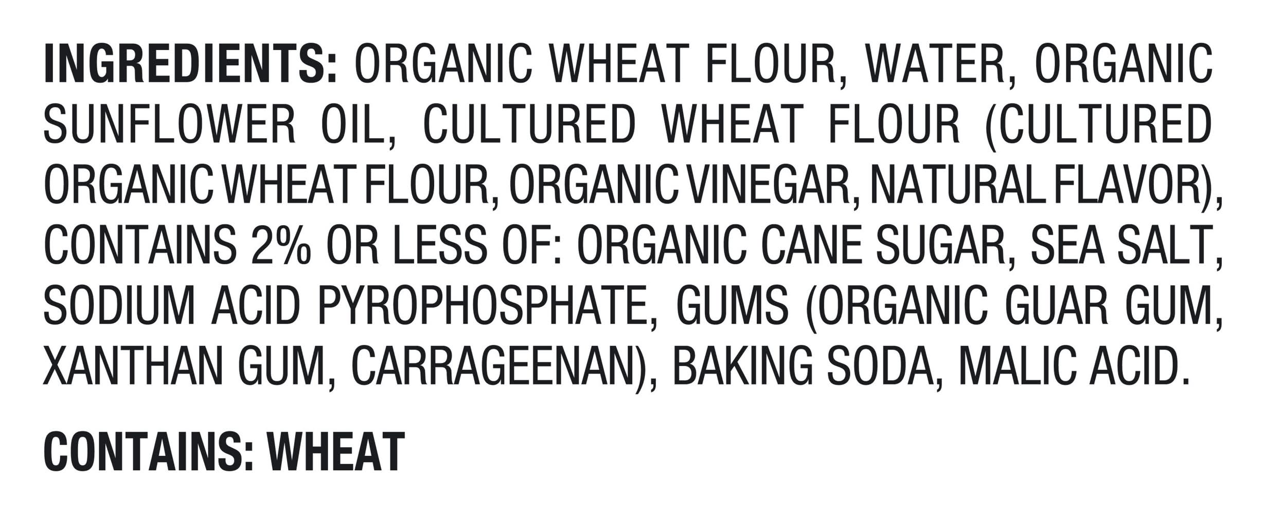 Ingredients: Organic Wheat Flour, Water, Organic Sunflower Oil, Natural Flavor (Fermented Wheat Flour), Organic Vinegar, Organic Cane Sugar, Contains 2% Or Less Of: Sea Salt, Sodium Acid Pyrophosphate, Gums (Organic Guar Gum, Xanthan Gum, Carrageenan), Baking Soda, Malic Acid. Contains: Wheat Contains: Contains: Wheat