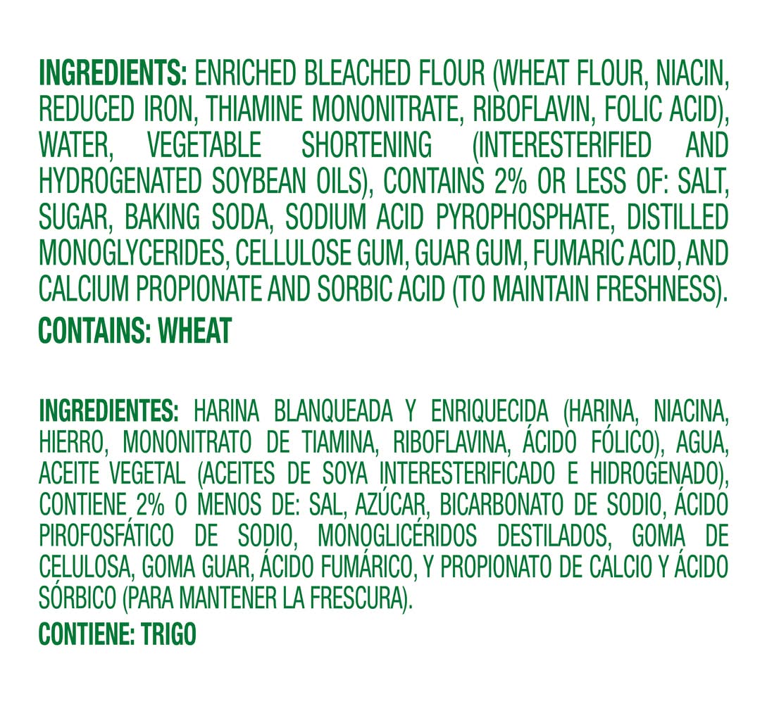 Ingredients: Enriched Bleached Flour (Flour, Niacin, Reduced Iron, Thiamine Mononitrate, Riboflavin, Folic Acid), Water, Vegetable Shortening (Interesterified And Hydrogenated Soybean Oils), Contains 2% Or Less Of: Salt, Sugar, Baking Soda, Sodium Acid Pyrophosphate, Distilled Monoglycerides, Enzymes, Cellulose Gum, Guar Gum, Fumaric Acid, And Calcium Propionate And Sorbic Acid (To Maintain Freshness). Contains: Wheat Contains: Contains: Wheat
