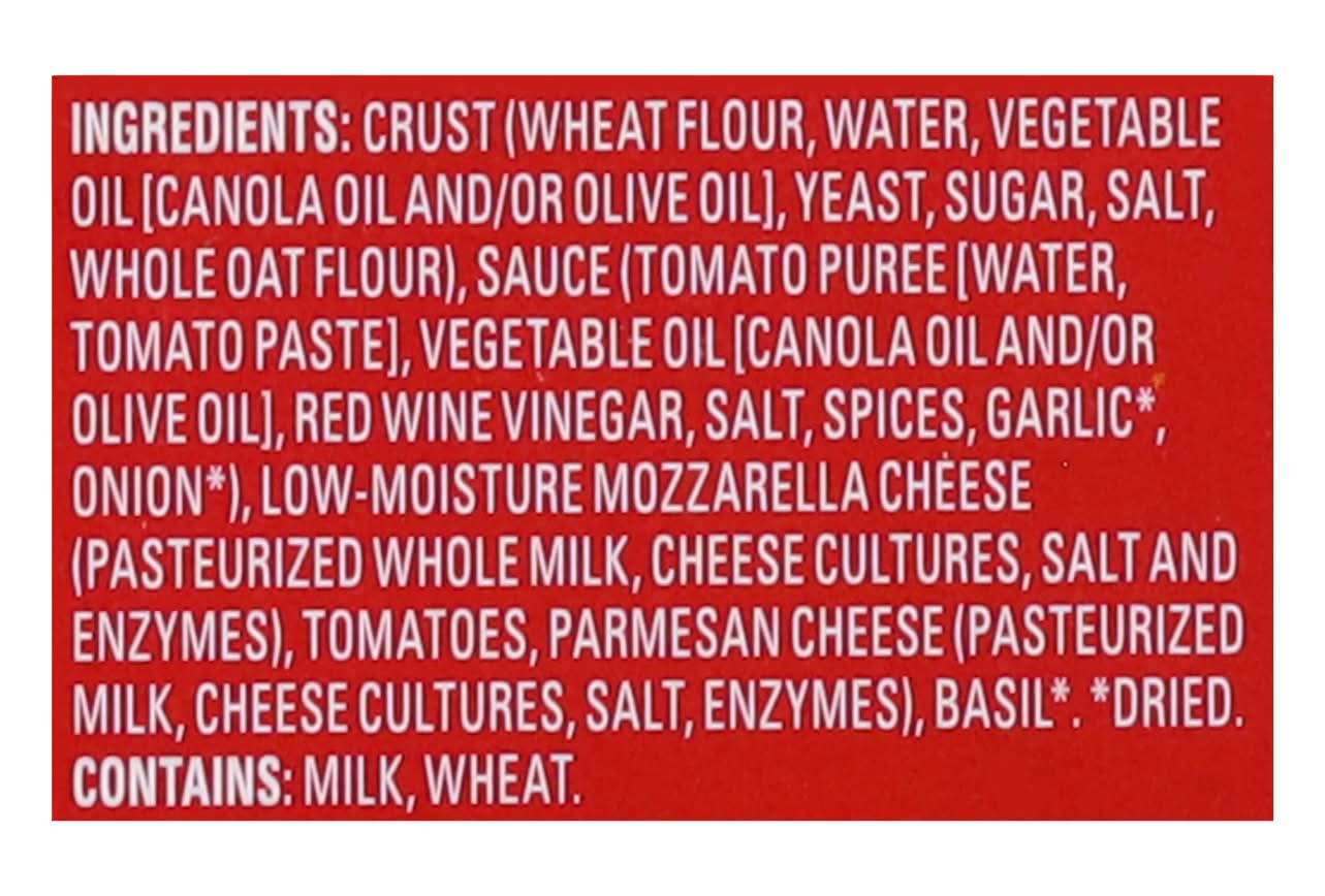 Ingredients: Crust (Wheat Flour, Water, Vegetable Oil [Canola Oil and/or Olive Oil], Yeast, Sugar, Salt, Whole Oat Flour), Sauce (Tomato Puree [Water, Tomato Paste], Vegetable Oil [Canola Oil and/or Olive Oil], Red Wine Vinegar, Salt, Spices, Garlic (Dried), Onion (Dried)), Low-Moisture Mozzarella Cheese (Pasteurized Whole Milk, Cheese Cultures, Salt and Enzymes), Tomatoes, Parmesan Cheese (Pasteurized Milk, Cheese Cultures, Salt, Enzymes), Basil (Dried) Contains: Milk, Wheat, Oat
