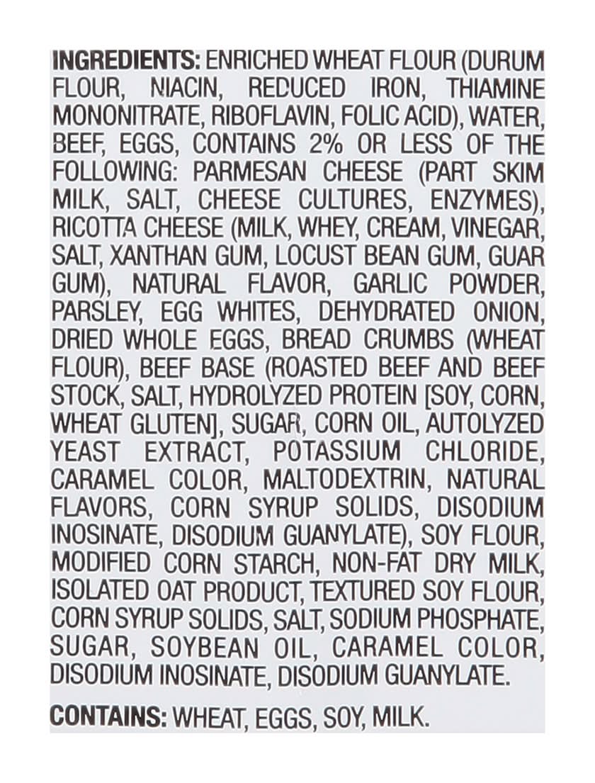 Ingredients: Enriched Wheat Flour (Durum Flour, Niacin, Reduced Iron, Thiamine Mononitrate, Riboflavin, Folic Acid), Water, Beef, Eggs, Contains 2% or Less of the Following: Parmesan Cheese (Part Skim Milk, Salt, Cheese Cultures, Enzymes), Ricotta Cheese (Milk, Whey, Cream, Vinegar, Salt, Xanthan Gum, Locust Bean Gum, Guar Gum), Natural Flavor, Garlic Powder, Parsley, Egg Whites, Dehydrated Onion, Dried Whole Eggs, Bread Crumbs (Wheat Flour), Beef Base (Roasted Beef and Beef Stock, Salt, Hydrolyzed Protein [Soy, Corn, Wheat Gluten], Sugar, Corn Oil, Autolyzed Yeast Extract, Potassium Chloride, Caramel Color, Maltodextrin, Natural Flavors, Corn Syrup Solids, Disodium Inosinate, Disodium Guanylate), Soy Flour, Modified Corn Starch, Non-Fat Dry Milk, Isolated Oat Product, Textured Soy Flour, Corn Syrup Solids, Salt, Sodium Phosphate, Sugar, Soybean Oil, Caramel Color, Disodium Inosinate, Disodium Guanylate Contains: Wheat, Eggs, Soybeans, Milk, Corn, Gluten