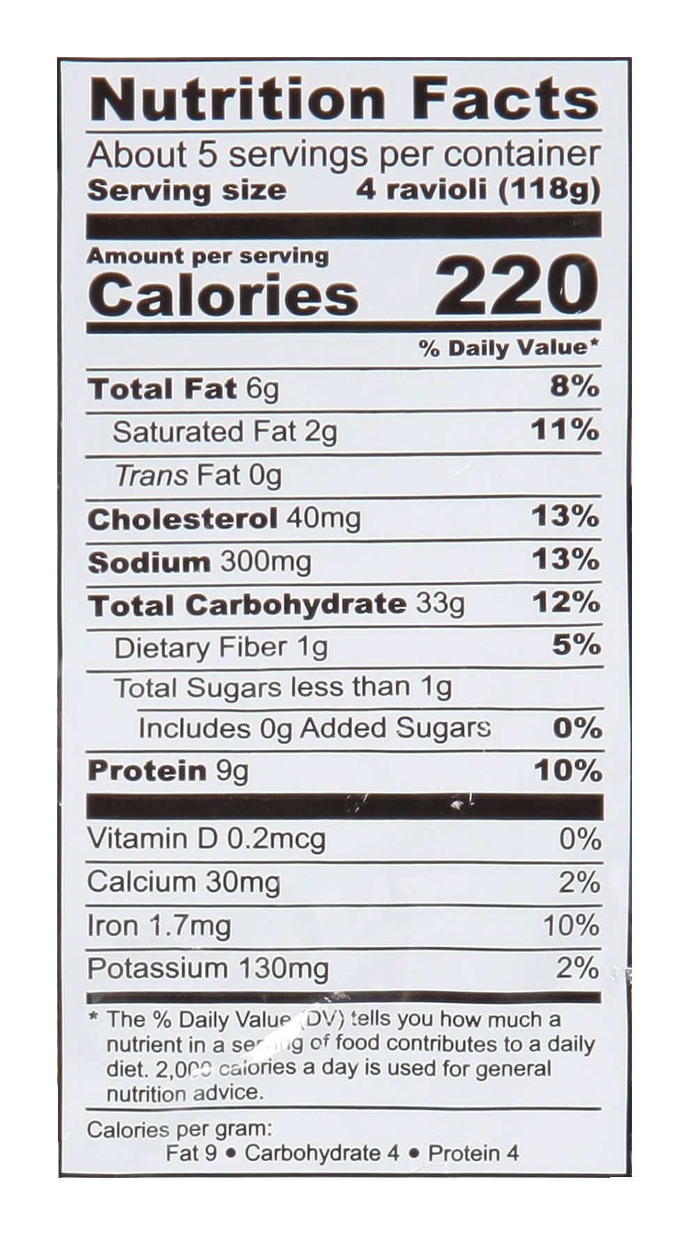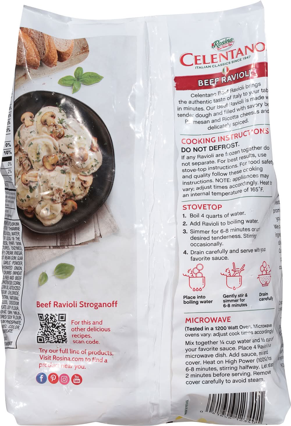 Directions for use: Cooking Instructions: Do not defrost. If any Ravioli are frozen together do not separate. For best results, use stove-top instructions. For food safety and quality follow these cooking instructions. Note: Appliances may vary; adjust times accordingly. Heat to an internal temperature of 165 degrees F. Stovetop: 1. Boil 4 quarts of water. 2. Add Ravioli to boiling water. 3. Simmer for 6-8 minutes or until desired tenderness. Stirring occasionally. 4. Drain carefully and serve with your favorite sauce. Place into boiling water. Gently stir & simmer for 6-8 minutes. Drain carefully. Microwave (Tested in a 1200 watt oven. Microwave ovens vary; adjust cook times accordingly). Mix together 1/4 cup water and 1/2 cup of your favorite sauce. Place 4 Ravioli in a microwave dish. Add sauce, mix and cover. Heat on high power (100%) for 6-8 minutes, stirring halfway. Let stand 2 minutes before serving. Remove cover carefully to avoid steam. Keep frozen. Storage recommendation: Keep frozen.