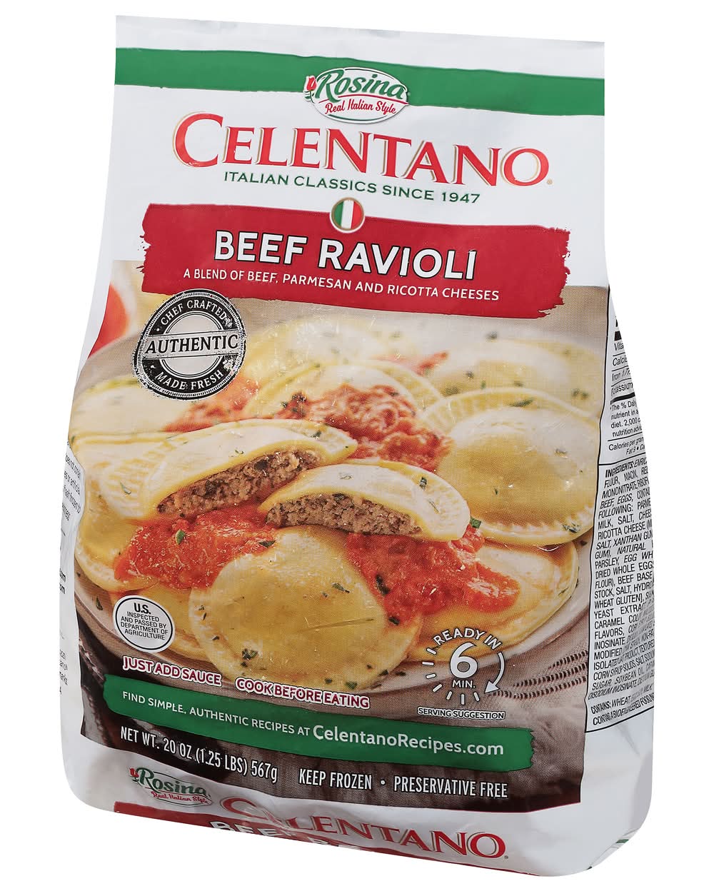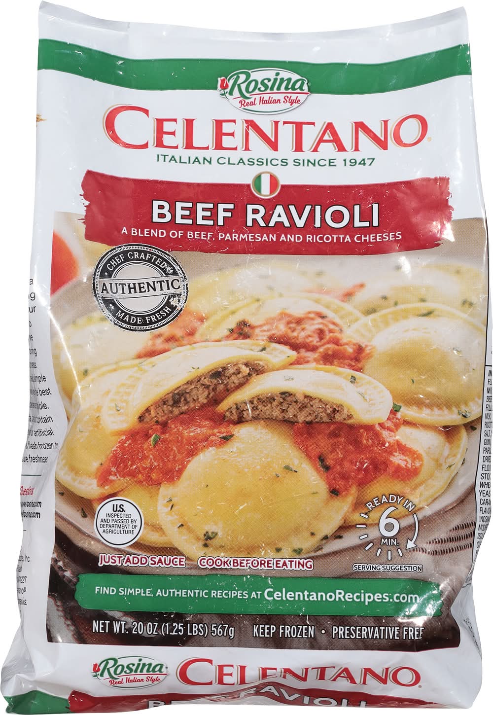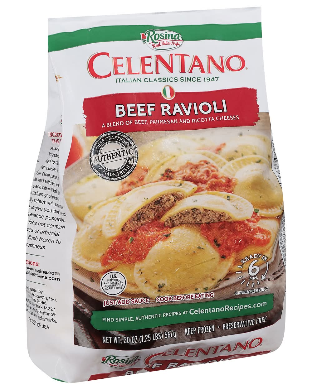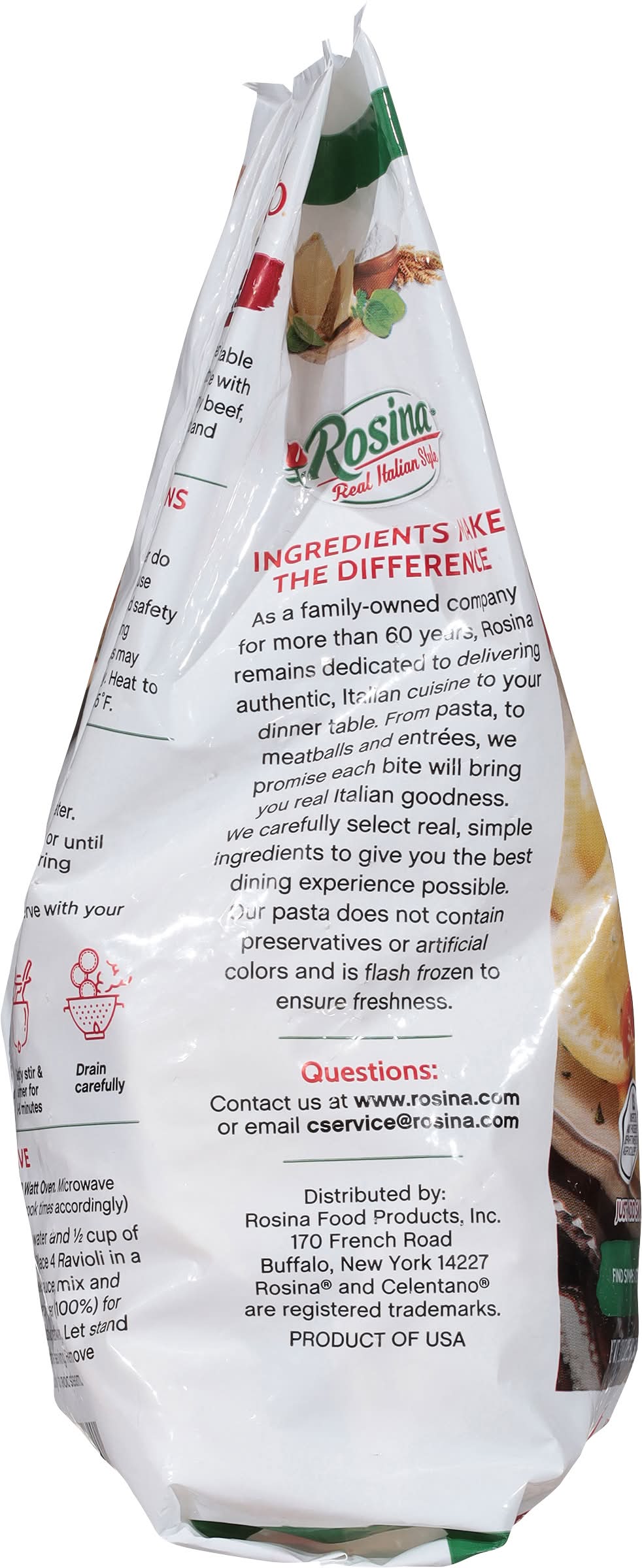 It offers a blend of authentic Italian flavors for a convenient meal option that can be prepared in approximately 6 minutes. This product is a source of protein and iron, crafted using fresh ingredients according to traditional homemade recipes. Ensuring a focus on quality, the ravioli is free from preservatives and has been inspected. Continuing a family-owned company's commitment to bringing Italian cuisine to your table. Rosina Food Products, Inc., 170 French Road,Buffalo,NY,14227