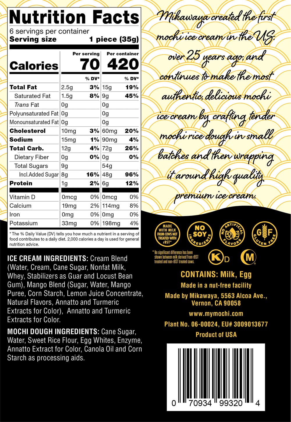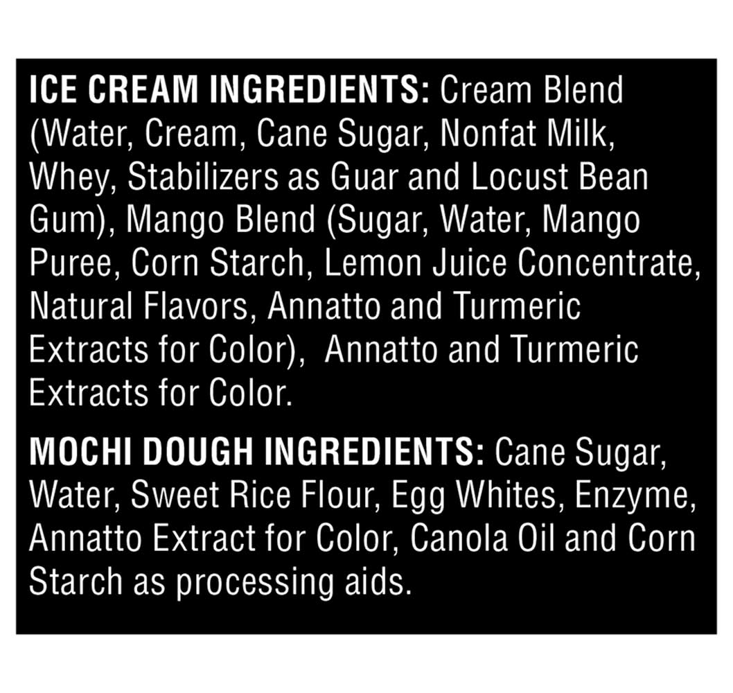 Ingredients: Ice Cream Ingredients: Cream Blend (Water, Cream, Cane Sugar, Nonfat Milk, Whey, Stabilizers as Guar and Locust Bean Gum), Mango Blend (Sugar, Water, Mango Puree, Corn Starch, Lemon Juice Concentrate, Natural Flavors, Annatto and Turmeric Extracts for Color), Annatto and Turmeric Extracts for Color, Mochi Dough Ingredients: Cane Sugar, Water, Sweet Rice Flour, Egg Whites, Enzyme, Annatto Extract for Color, Canola Oil and Corn Starch as Processing Aids Contains: Milk, Eggs, Peanuts, Tree Nuts, Wheat