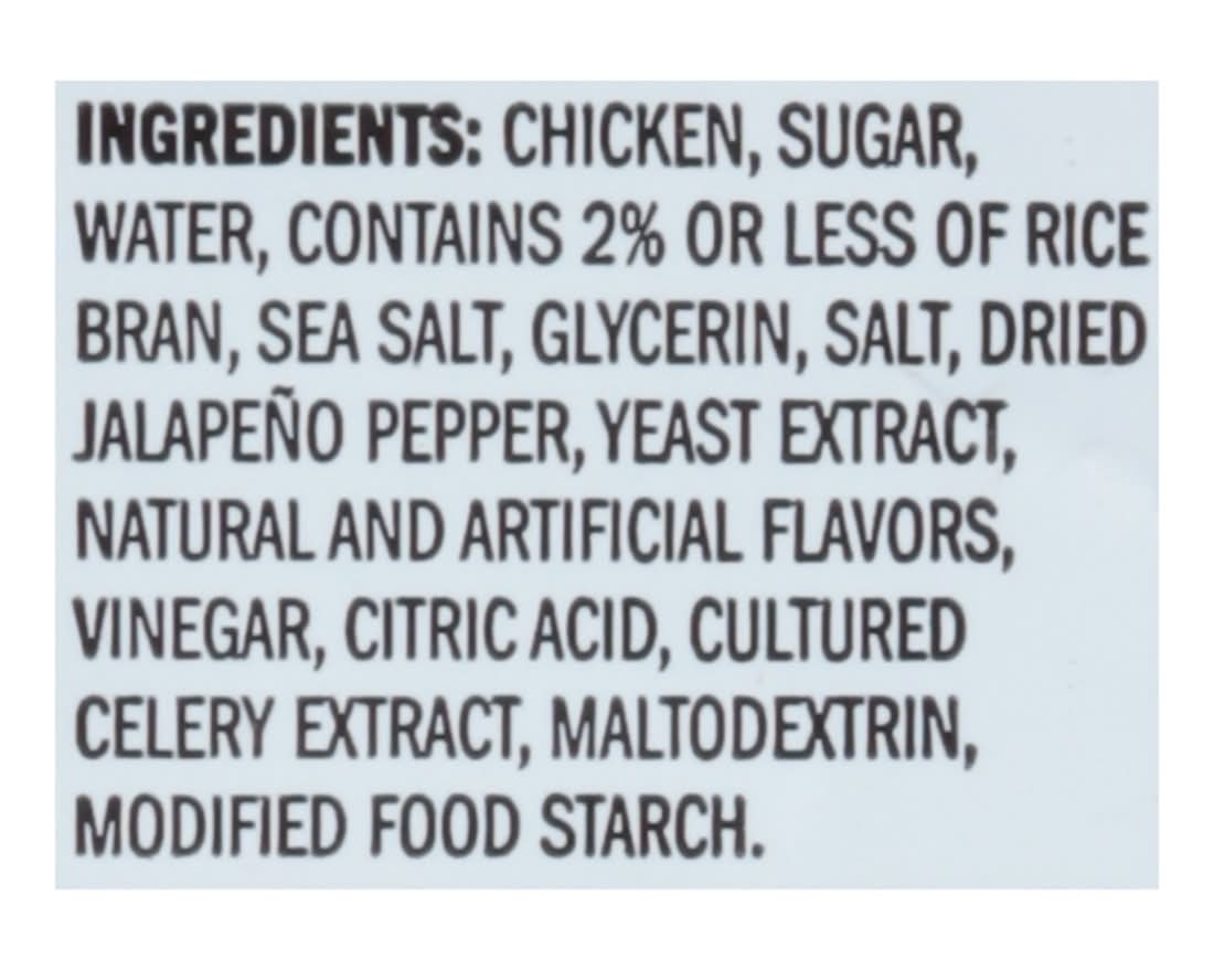 Ingredients: Chicken, Sugar, Water, Contains 2% or Less of Rice Bran, Sea Salt, Glycerin, Salt, Dried Jalapeño Pepper, Yeast Extract, Natural and Artificial Flavors, Vinegar, Citric Acid, Cultured Celery Extract, Maltodextrin, Modified Food Starch Contains: Celery