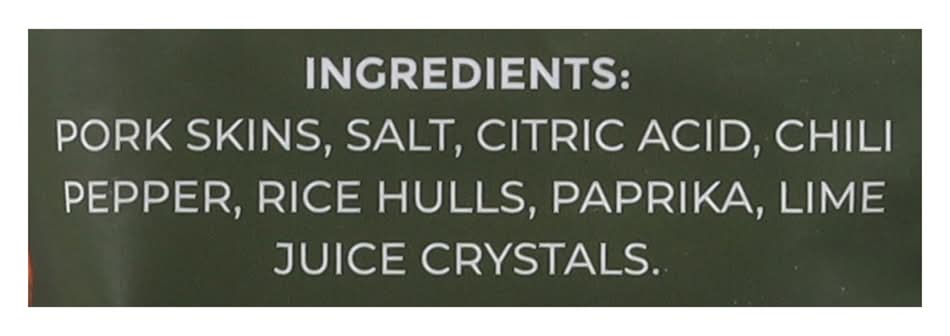 Ingredients: Pork Skins, Salt, Citric Acid, Chili Pepper, Rice Hulls, Paprika, Lime Juice Crystals