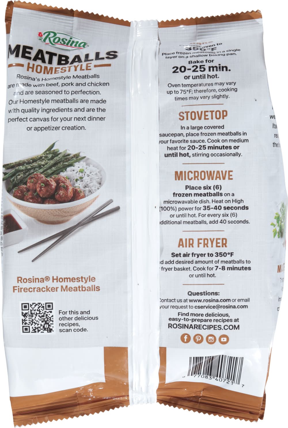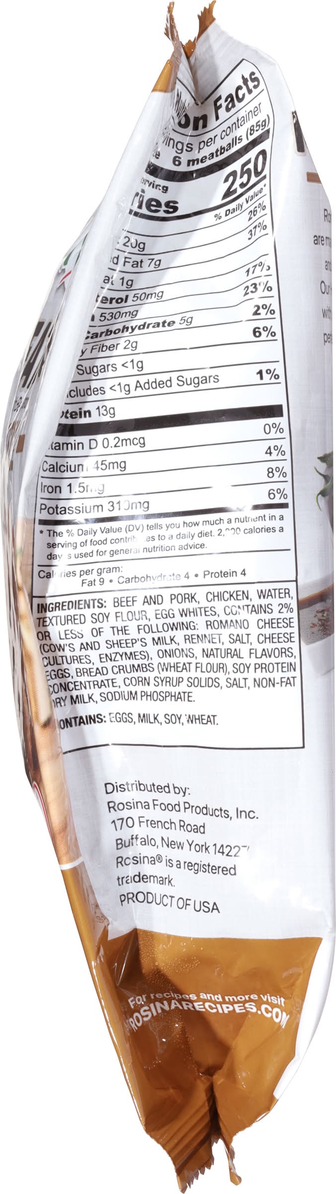 These are a blend of beef, pork, and chicken, crafted to deliver a homemade taste. These meatballs are free from preservatives, fully cooked, and can be heated in the microwave for convenience. With approximate meatballs per package, each weighing 1/2 ounce, they offer a quick and easy option for meals. Recognized for their oven-baked quality, these meatballs are sear-sealed to preserve flavor. They are ideal for a variety of occasions, from family dinners to gatherings with friends. Inspected and approved by the Department of Agriculture, Homestyle Meatballs are produced in the USA. • Number of servings: 9 • Rosina Food Products, Inc., Buffalo, New York, 14227