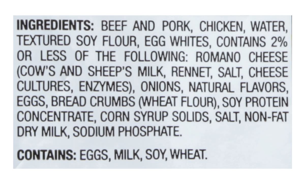 Ingredients: Beef and Pork, Chicken, Water, Textured Soy Flour, Egg Whites, Contains 2% or Less of the Following: Romano Cheese (Pasteurized Cow's and Sheep's Milk, Rennet, Salt, Cheese Cultures, Enzymes), Dehydrated Onions, Natural Flavors, Eggs, Bread Crumbs (Wheat Flour), Soy Protein Concentrate, Corn Syrup Solids, Salt, Non-Fat Dry Milk, Sodium Phosphate Contains: Eggs, Milk, Soybeans, Wheat, Corn