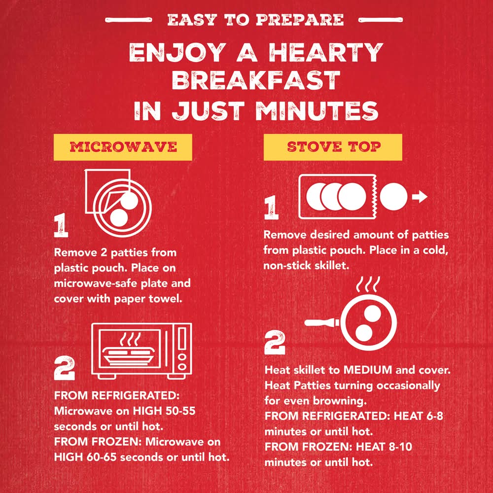 Brighten up your morning with these easy-to-prepare sausage patties. Made with quality pork, seasoned to perfection with our signature blend of spices, Heat 'N Serve Pork Breakfast Sausage Patties have protein per serving to give you more fuel to power your day. Simple to prepare and ready in minutes, just microwave and serve with eggs and toast for a traditional breakfast or with biscuits and gravy for brunch.