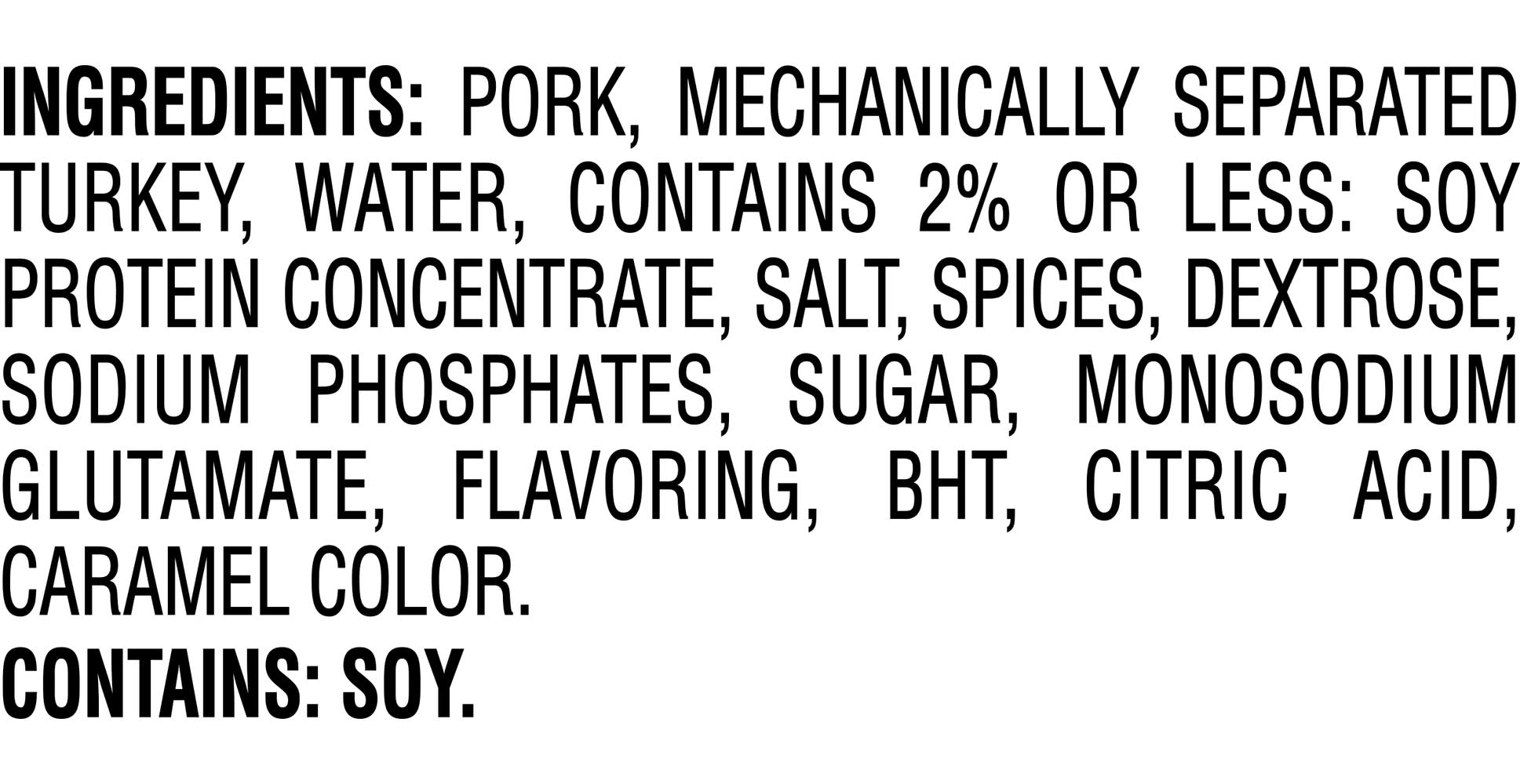 Ingredients: Pork, Mechanically Separated Turkey, Water, Contains 2% Or Less: Soy Protein Concentrate, Salt, Spices, Dextrose, Sodium Phosphates, Sugar, Monosodium Glutamate, Flavoring, BHT, Citric Acid, Caramel Color. Contains: Soy