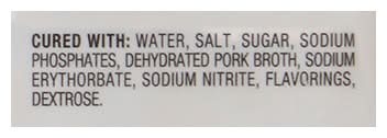 Ingredients: Cured with: Water, Salt, Sugar, Sodium Phosphates, Dehydrated Pork Broth, Sodium Erythorbate, Sodium Nitrite, Flavorings, Dextrose