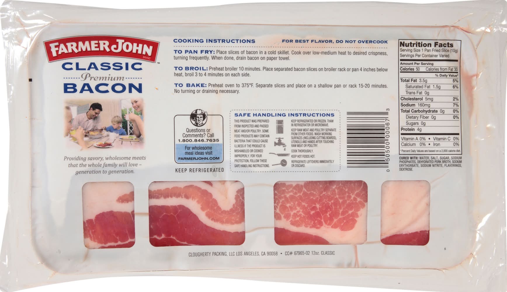 Directions for use: Safe Handling Instructions: This product was prepared from inspected and passed meat and/or poultry. Some food products may contain bacteria that could cause illness if the product is mishandled or cooked improperly. For your protection, follow these safe handling instructions. Keep refrigerated or frozen. Thaw in refrigerator or microwave. Keep raw meat and poultry separate from other foods. Wash working surfaces (including cutting boards), utensils and hands after touching raw meat or poultry. Cook thoroughly. Keep hot foods hot. Refrigerate leftovers immediately or discard. Cooking Instructions: For best flavor, do not over cook. To Pan Fry: Place slices of bacon in a cold skillet. Cook over low-medium heat to desired crispness, turning frequently. When done, drain bacon on paper towel. To Broil: Preheat broiler 10 minutes. Place separated bacon slices on broiler rack or pan 4 inches below heat, broil to 4 minutes on each side. To Bake: Preheat oven to 375 degrees F. Separate slices and place on a shallow pan or rack 15-20 minutes. No turning or draining necessary. Keep refrigerated. Use or freeze by. Storage recommendation: Keep refrigerated.