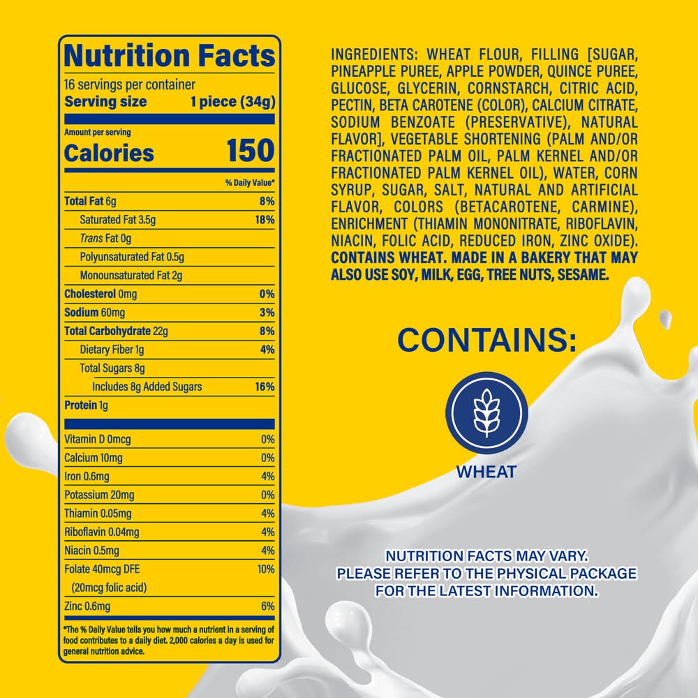 Ingredients: WHEAT FLOUR, FILLING [SUGAR, PINEAPPLE PUREE, APPLE POWDER, QUINCE PUREE, GLUCOSE, GLYCERIN, CORNSTARCH, CITRIC ACID, PECTIN, BETA CAROTENE (COLOR), CALCIUM CITRATE, SODIUM BENZOATE (PRESERVATIVE), NATURAL FLAVOR], VEGETABLE SHORTENING [PALM OIL, FRACTIONATED PALM OIL, PALM KERNEL OIL, FRACTIONATED PALM KERNEL OIL], WATER, CORN SYRUP, SUGAR, SALT, NATURAL AND ARTIFICIAL FLAVOR, COLORS [BETA CAROTENE, CARMINE], ENRICHMENT [THIAMIN MONONITRATE, RIBOFLAVIN, NIACIN, FOLIC ACID, REDUCED IRON, ZINC OXIDE], . Contains: Wheat, Soybeans, Milk, Eggs, Peanuts, Tree Nuts