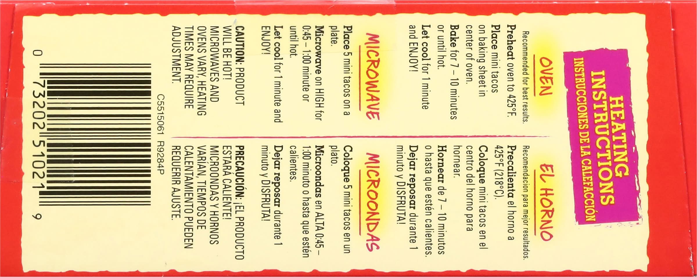 Directions for use: Heating Instructions: Oven: Recommended for best results. Preheat oven to 425 degrees F. Place mini tacos on baking sheet in center of oven. Bake for 7-10 minutes or until hot. Let cool for 1 minute and enjoy! Microwave: Place 5 mini tacos on a plate. Microwave on high for 0:45-1:00 minute or until hot. Let cool for 1 minute. Caution: Product will be hot! Microwaves and ovens vary, heating times may require adjustment. Keep frozen. Storage recommendation: Keep frozen.