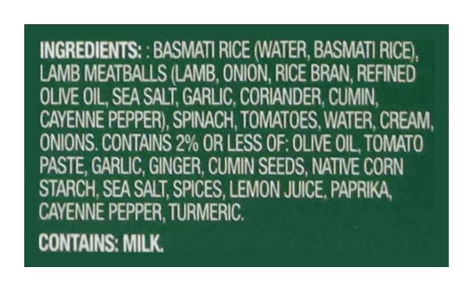 Ingredients: Basmati Rice (Water, Basmati Rice), Lamb Meatballs (Lamb, Onion, Rice Bran, Refined Olive Oil, Sea Salt, Garlic, Coriander, Cumin, Cayenne Pepper), Spinach, Tomatoes, Water, Cream, Onions, Contains 2% or Less of: Olive Oil, Tomato Paste, Garlic, Ginger, Cumin Seeds, Native Corn Starch, Sea Salt, Spices, Lemon Juice, Paprika, Cayenne Pepper, Turmeric Contains: Milk