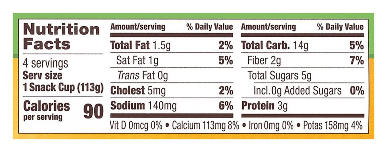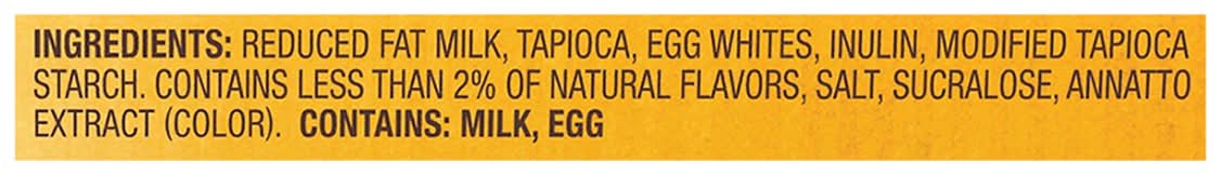 Ingredients: Reduced Fat Milk, Tapioca, Egg Whites, Inulin, Modified Tapioca Starch. Contains Less than 2% of Natural Flavors, Salt, Sucralose, Annatto Extract (Color) Contains: Milk, Eggs, Lactose