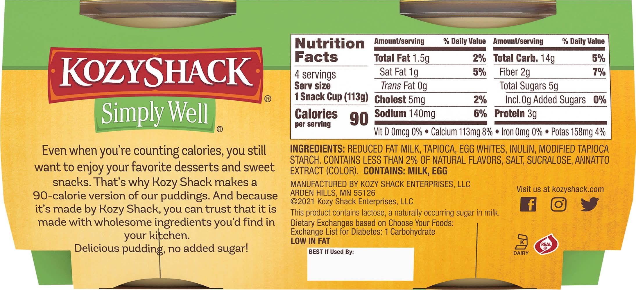 No Sugar Added Gluten Free Tapioca Pudding • Number of servings: 4 • Kozy Shack Enterprises, LLC, Arden Hills, MN, 55126.