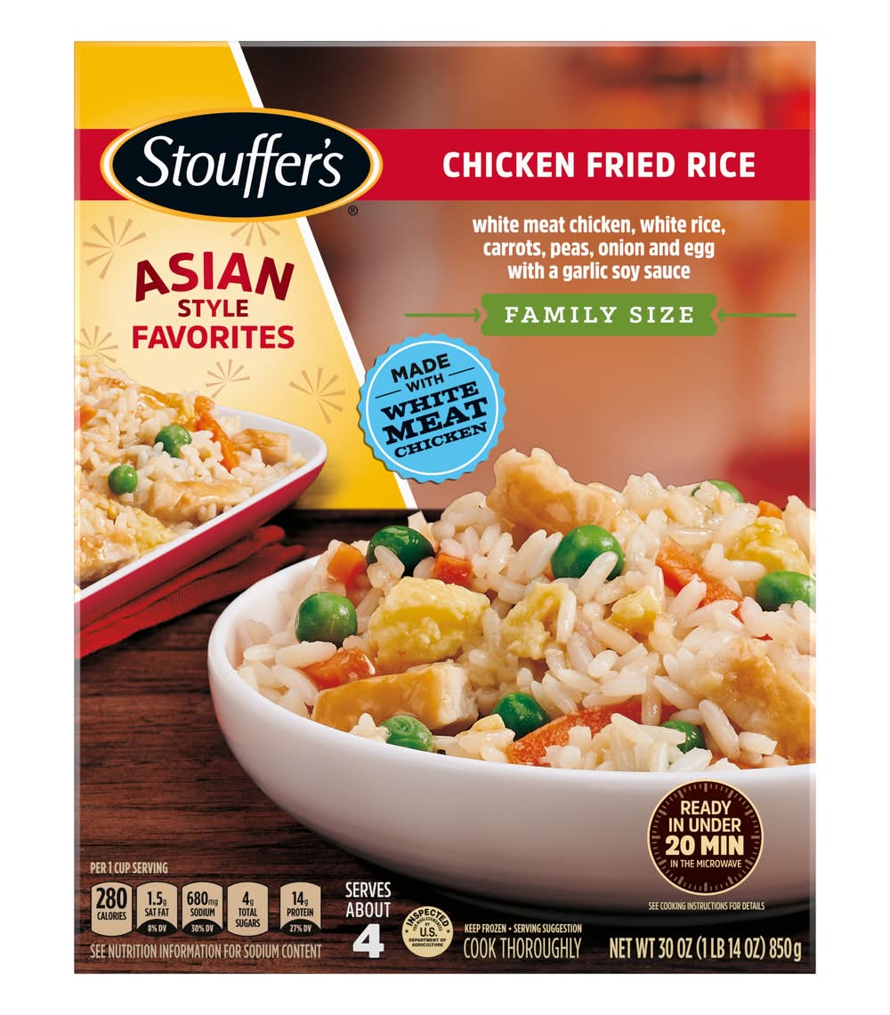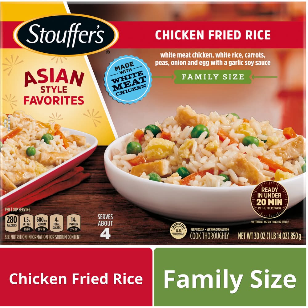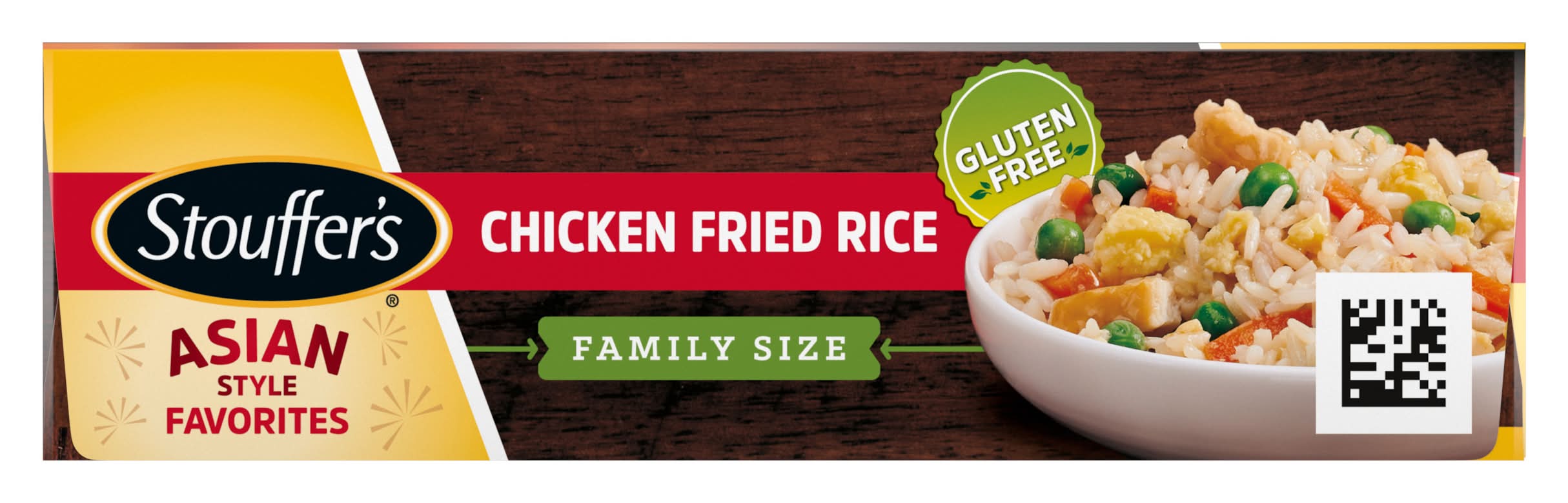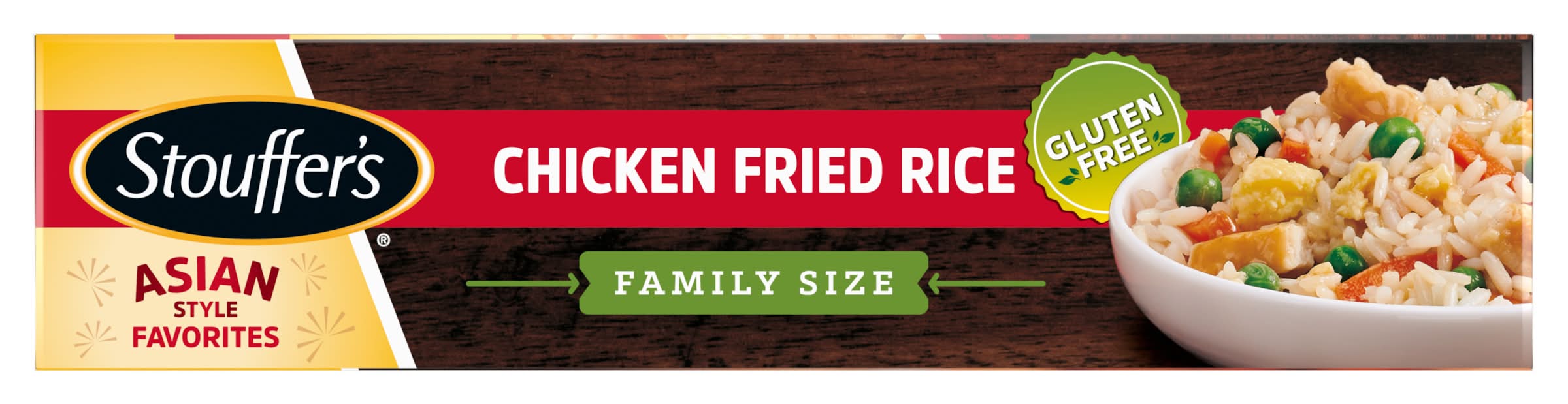 Stouffer's Family Size Chicken Fried Rice frozen dish combines quality ingredients and delicious flavor into one quick dinner. Featuring white real meat chicken, white rice, carrots, peas, onions and egg with a garlic soy sauce, this Stouffer’s Asian Style Favorites frozen entree is sure to satisfy every taste bud. Family Size Stouffers Chicken Fried Rice frozen dinners contain 14 grams of protein per serving for an easy-to-prepare frozen dinner that is equal parts delicious and filling. Enjoy these frozen dishes when you want a dish with a home-cooked taste that's ready in under 20 minutes or prepare Stouffer's frozen dinners for a convenient dinner option on busy weeknights. Microwave prep makes these frozen entrees a great choice when you're short on time. Each box contains one family size frozen dinner. Keep Stouffer's Family Size Chicken Fried Rice frozen entree frozen until ready to enjoy.