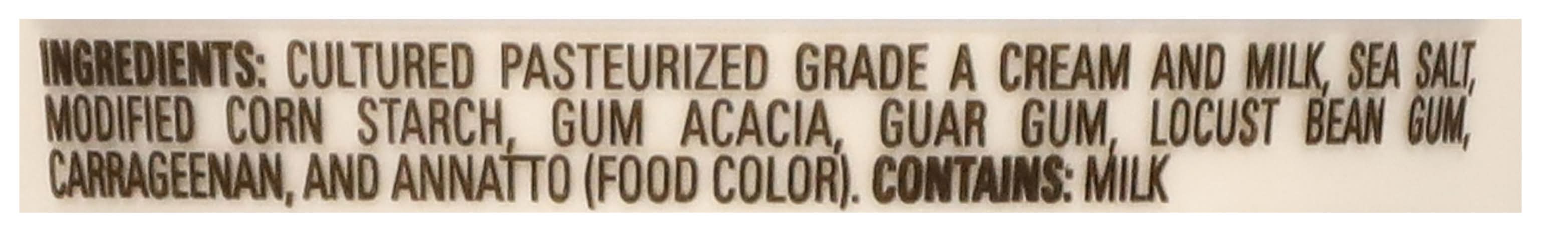 Ingredients: Cultured Pasteurized Grade A Cream and Milk, Sea Salt, Modified Corn Starch, Gum Acacia, Guar Gum, Locust Bean Gum, Carrageenan, and Annatto (Food Color)
