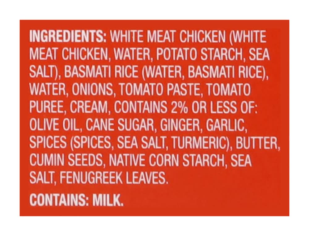Ingredients: White Meat Chicken (White Meat Chicken, Water, Potato Starch, Sea Salt), Basmati Rice (Water, Basmati Rice), Water, Onions, Tomato Paste, Tomato Puree, Cream, Contains 2% or Less of: Olive Oil, Cane Sugar, Ginger, Garlic, Spices (Spices, Sea Salt, Turmeric), Butter, Cumin Seeds, Native Corn Starch, Sea Salt, Fenugreek Leaves Contains: Corn, Milk