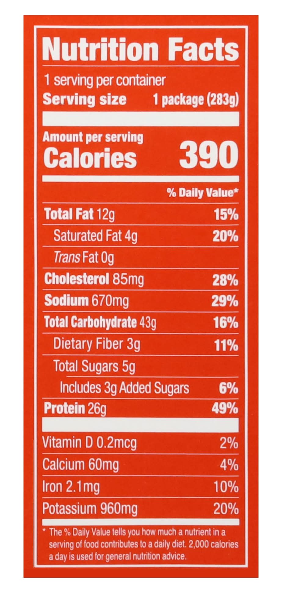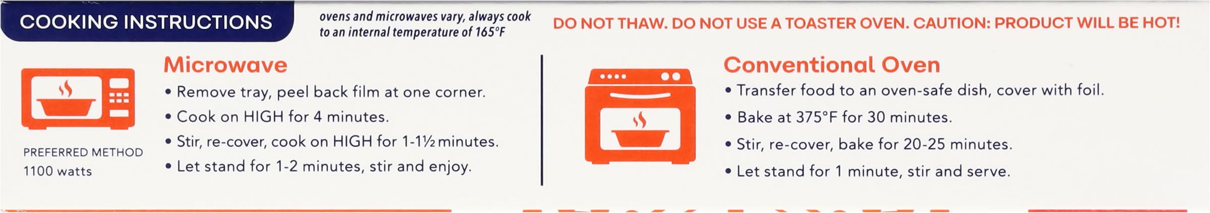 Directions for use: Cooking Instructions: Preferred Method. Microwave 1100 watts Remove tray from carton and peel back film at one corner for venting. Cook on high for 4 minutes. Peel film back enough to stir, replace film and cook on high for an additional 1 - 1-1/2 minutes. Let stand 1-2 minutes, stir and serve. Conventional Oven: Preheat oven to 375 degrees F. Transfer food to an oven-safe dish and cover with foil. Cook for 30 minutes, stir and cook for an additional 20-25 minutes. Let stand 1 minute, stir and serve. Do not thaw. Do not use a toaster oven. Caution: Product will be hot. Storage recommendation: Keep frozen.