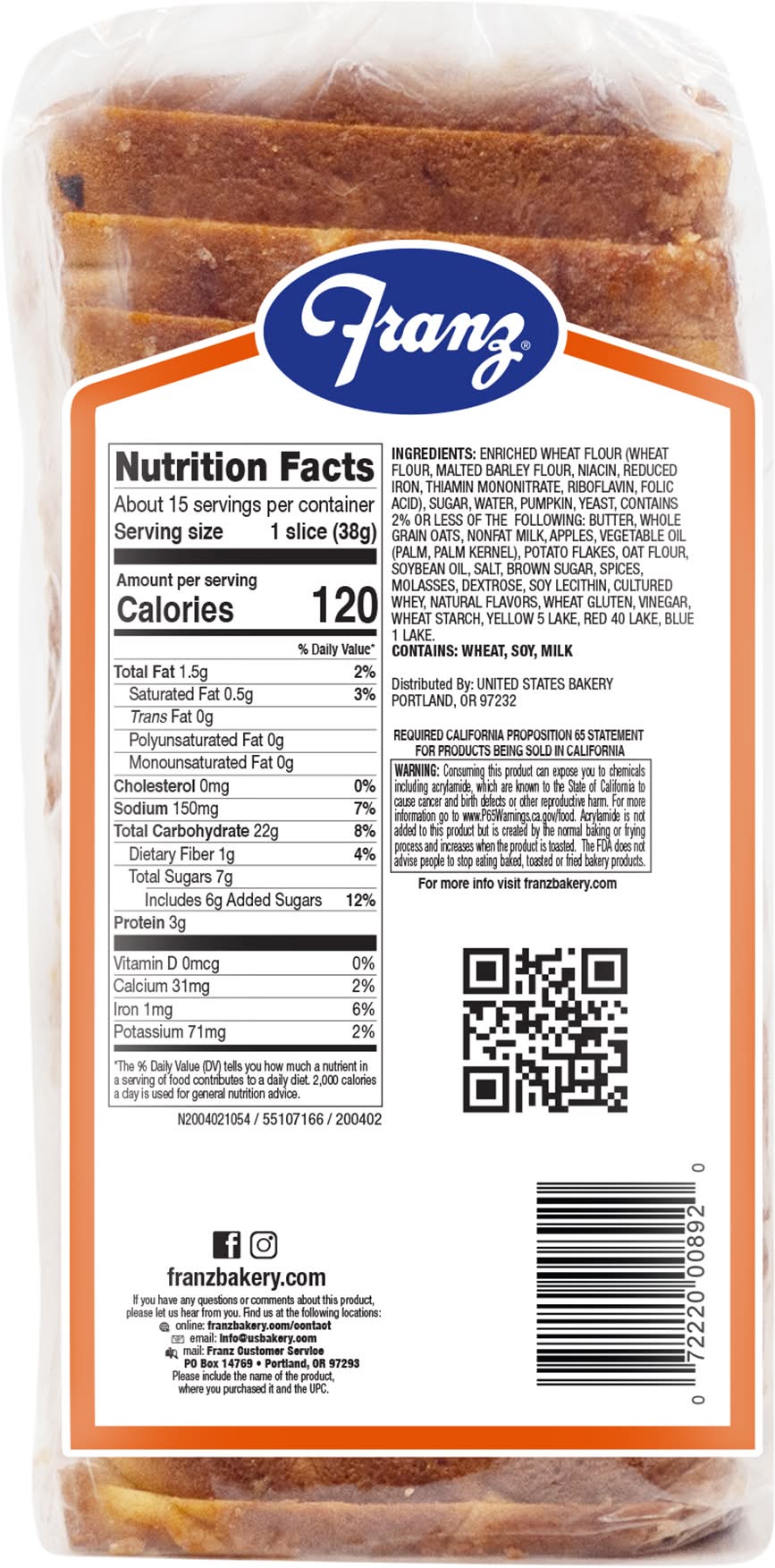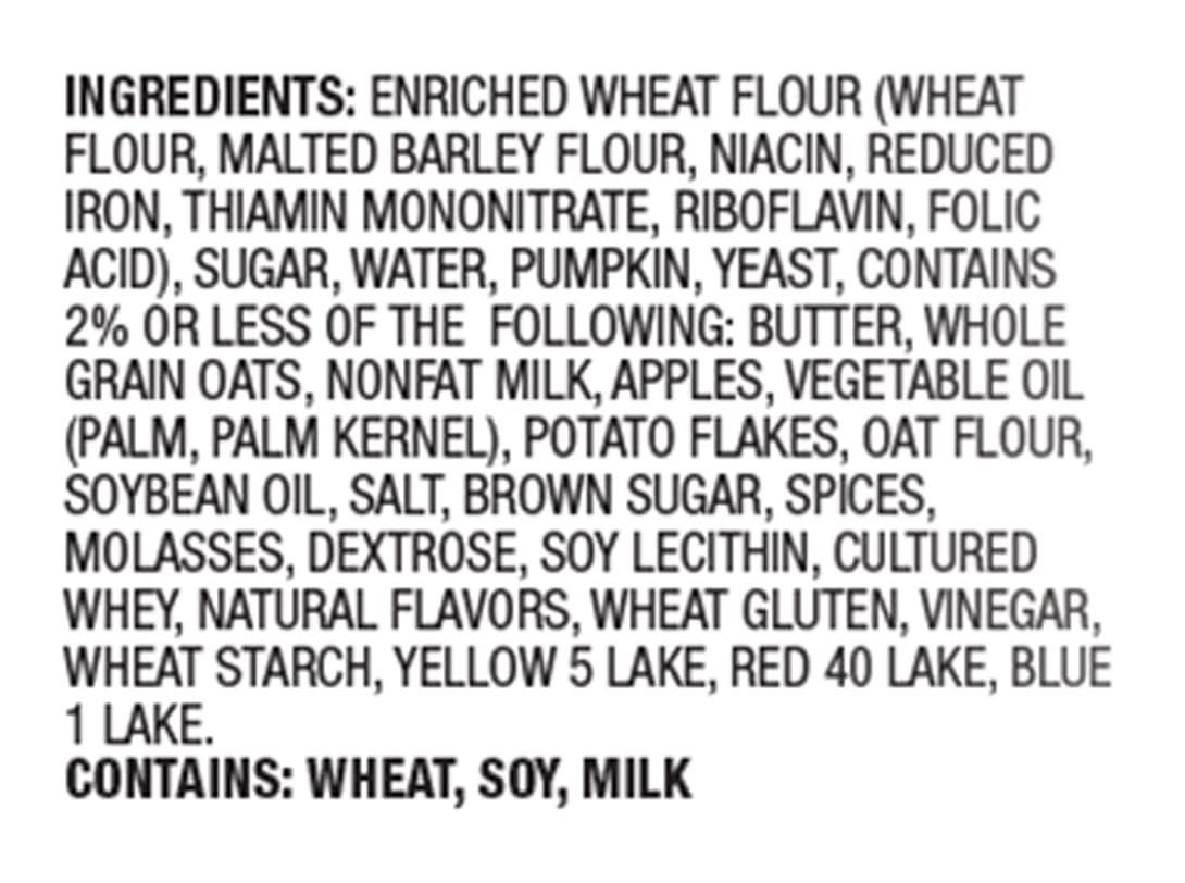 Ingredients: Enriched Wheat Flour (Wheat Flour, Malted Barley Flour, Niacin, Reduced Iron, Thiamin Mononitrate, Riboflavin, Folic Acid), Sugar, Water, Pumpkin, Yeast, Contains 2% or Less of the Following: Butter, Whole Grain Oats, Nonfat Milk, Apples, Vegetable Oil (Palm, Palm Kernel), Potato Flakes, Oat Flour, Soybean Oil, Salt, Brown Sugar, Spices, Molasses, Dextrose, Soy Lecithin, Cultured Whey Natural Flavors, Wheat Gluten, Vinegar, Wheat Starch, Yellow 5 Lake, Red 40 Lake, Blue 1 Lake Contains: Wheat, Barley, Milk, Soybeans, Oat, Gluten
