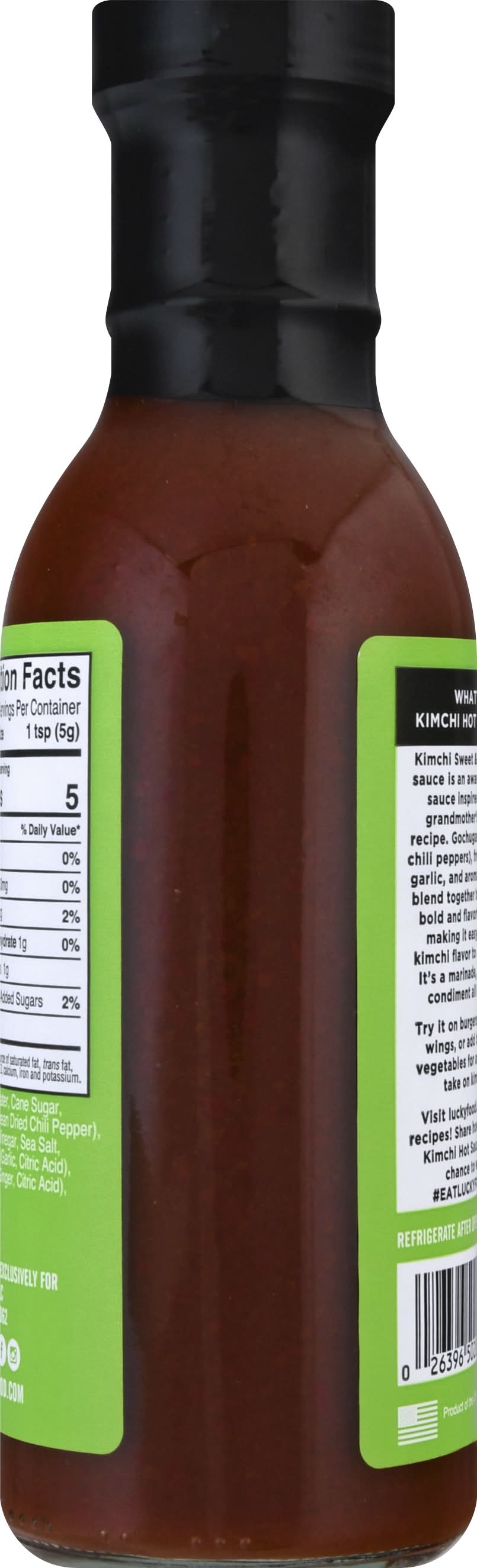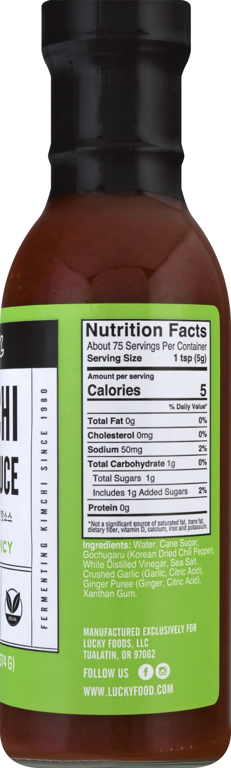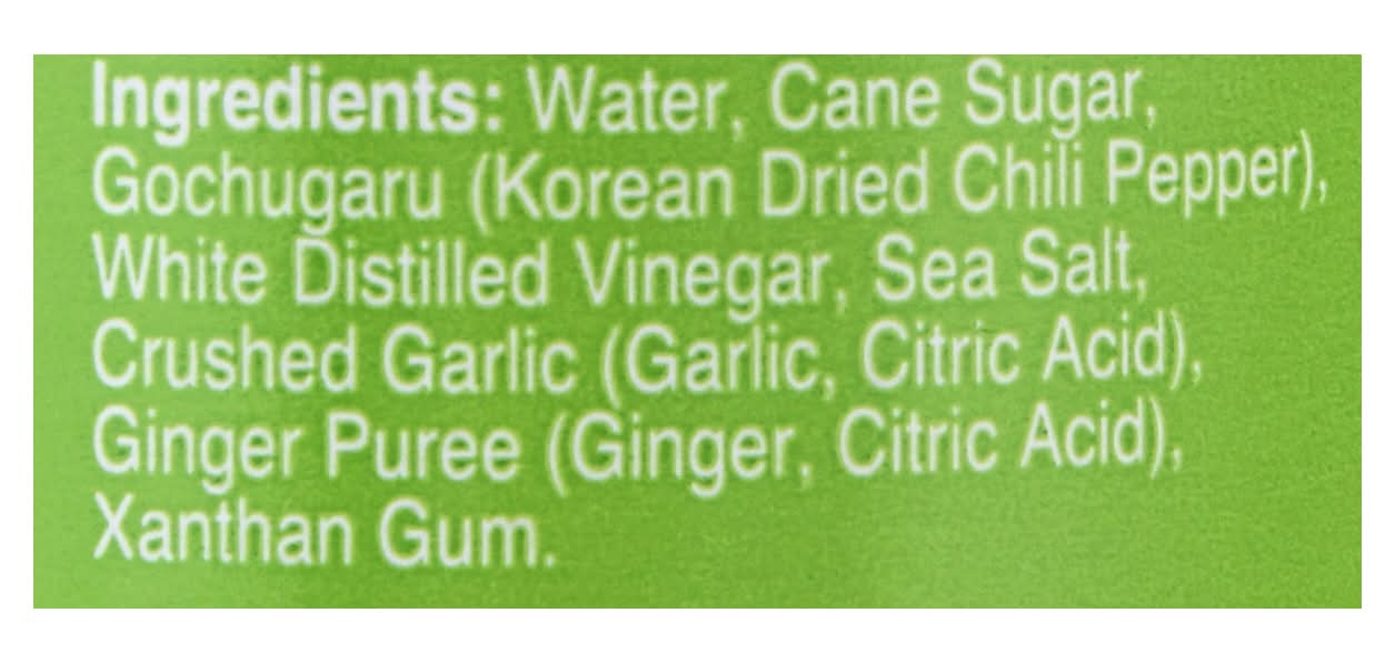 Ingredients: Water, Cane Sugar, Gochugaru (Korean Dried Chili Pepper), White Distilled Vinegar, Sea Salt, Crushed Garlic (Garlic, Citric Acid), Ginger Puree (Ginger, Citric Acid Xanthan Gum