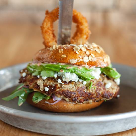 House-made veggie burger topped with Swiss cheese, avocado, roasted bell peppers, arugula, red onions, & roasted red pepper mayo served on a wheat bun.
