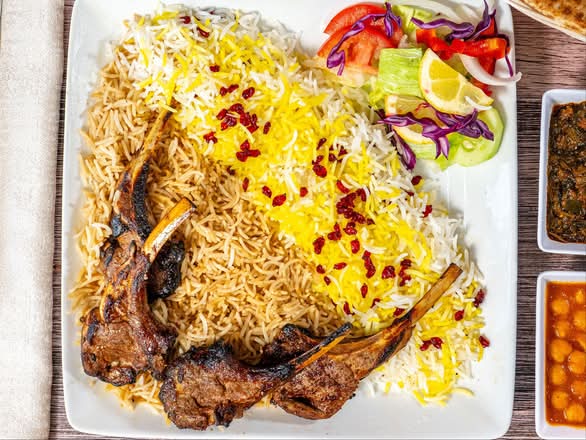 Lamb Chops Platter is tenderly grilled kabob served with 2 basmati rice (Palaw & Chalaw), Fresh green salad on the side served with choice of Chickpeas or Spinach on the side. Half of Fresh Clay Tandoori bread is served and green and White sauces come with the platter.