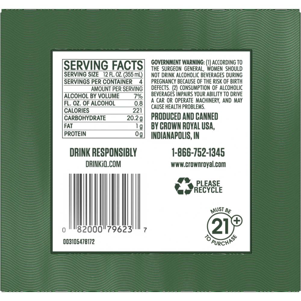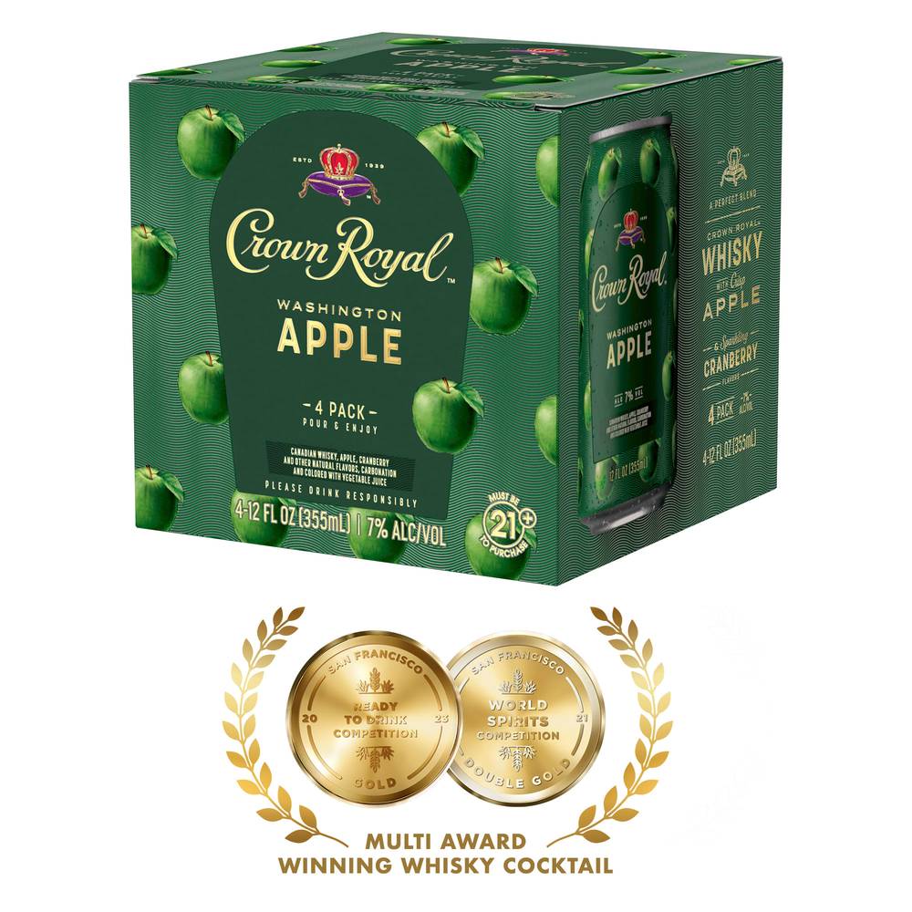 Crown Royal Washington Apple Canadian Whisky Cocktail is a ready-to-drink beverage presented in a can, blending the smooth taste of Crown Royal Whisky with the sweet-tart essence of Washington green apples. This cocktail boasts additional flavors of apple and sparkling cranberry, creating a rich and refreshing taste profile. It is ideally served poured over ice, optionally garnished with an apple slice. Additionally, it was recognized with a double gold medal at the 2021 San Francisco World Spirits Competition. Responsible drinking is recommended. • Pack size: 4 • Alcohol by volume: 0.07% • Packaging: Reusable