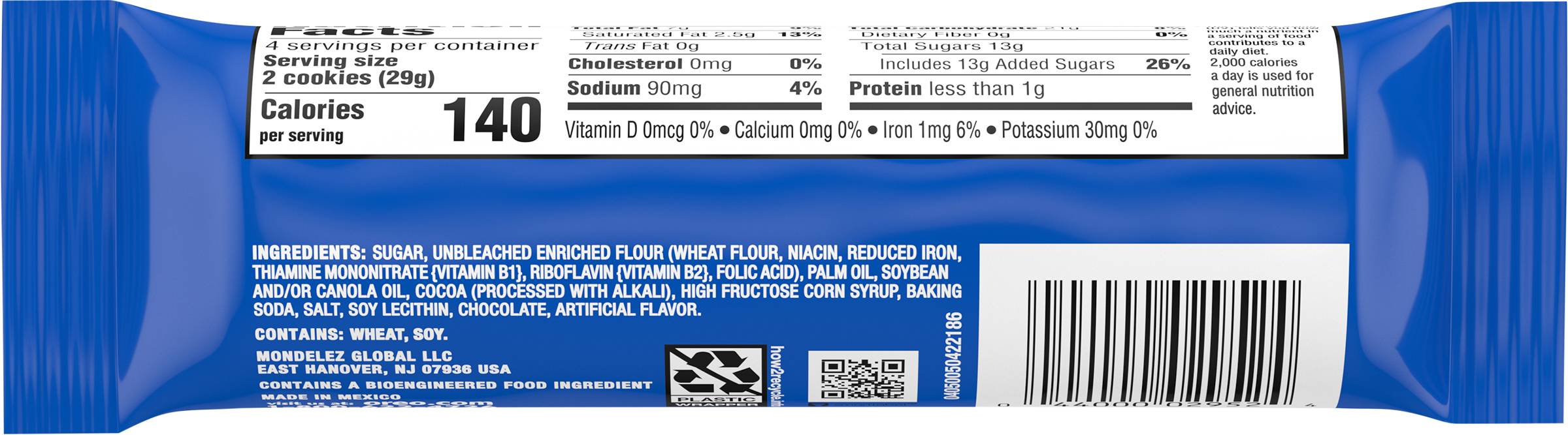 Ingredients: Sugar, Unbleached Enriched Flour (Wheat Flour, Niacin, Reduced Iron, Thiamine Mononitrate {Vitamin B1}, Riboflavin {Vitamin B2}, Folic Acid), Palm Oil, Soybean and/or Canola Oil, Cocoa (Processed with Alkali), High Fructose Corn Syrup, Baking Soda, Salt, Soy Lecithin, Chocolate, Artificial Flavor. Contains: Wheat, Soybeans, Corn