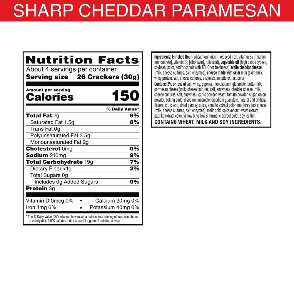 Ingredients: Enriched Flour Wheat Flour, Niacin, Reduced Iron, Vitamin B1 [Thiamin Mononitrate], Vitamin B2 [Riboflavin], Folic Acid, Vegetable Oil Soybean and Palm Oil with TBHQ for Freshness, Cheese Made with Skim Milk Skim Milk, Whey Protein, Salt, Cheese Cultures, Enzymes, Annatto Extract Color, Contains 2% or Less of White Cheddar Cheese Milk, Cheese Cultures, Salt, Enzymes, Salt, Whey, Spices, Monosodium Glutamate, Buttermilk, Parmesan Cheese Milk, Cheese Cultures, Salt, Enzymes, Cheddar Cheese Milk, Cheese Cultures, Salt, Enzymes, Garlic Powder, Yeast, Tomato Powder, Sugar, Onion Powder, Baking Soda, Disodium Inosinate, Disodium Guanylate, Natural and Artificial Flavors, Annatto Extract Color, Paprika Extract Color, Citric Acid, Dried Parsley, Monterey Jack Cheese Milk, Cheese Cultures, Salt, Enzymes, Malic Acid, Spice Extract, Yeast Extract, Turmeric Extract Color, Yellow 5, Yellow 6, Soy Lecithin. Contains: Wheat, Milk, Soybeans