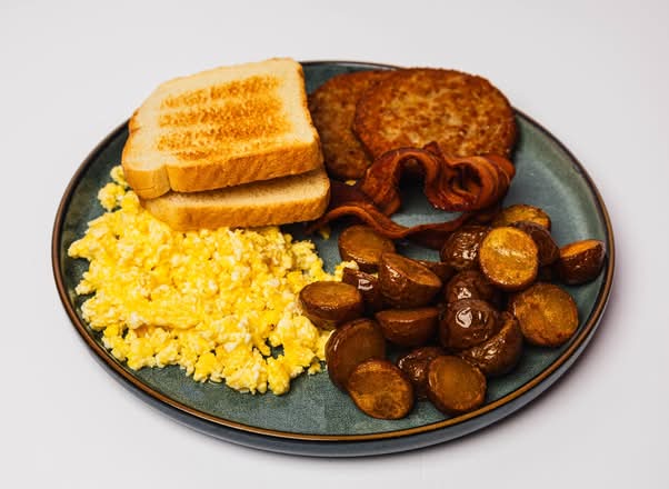 Choice over-easy over-hard or scrambled eggs . with toast, home fries, two sausage and two bacon