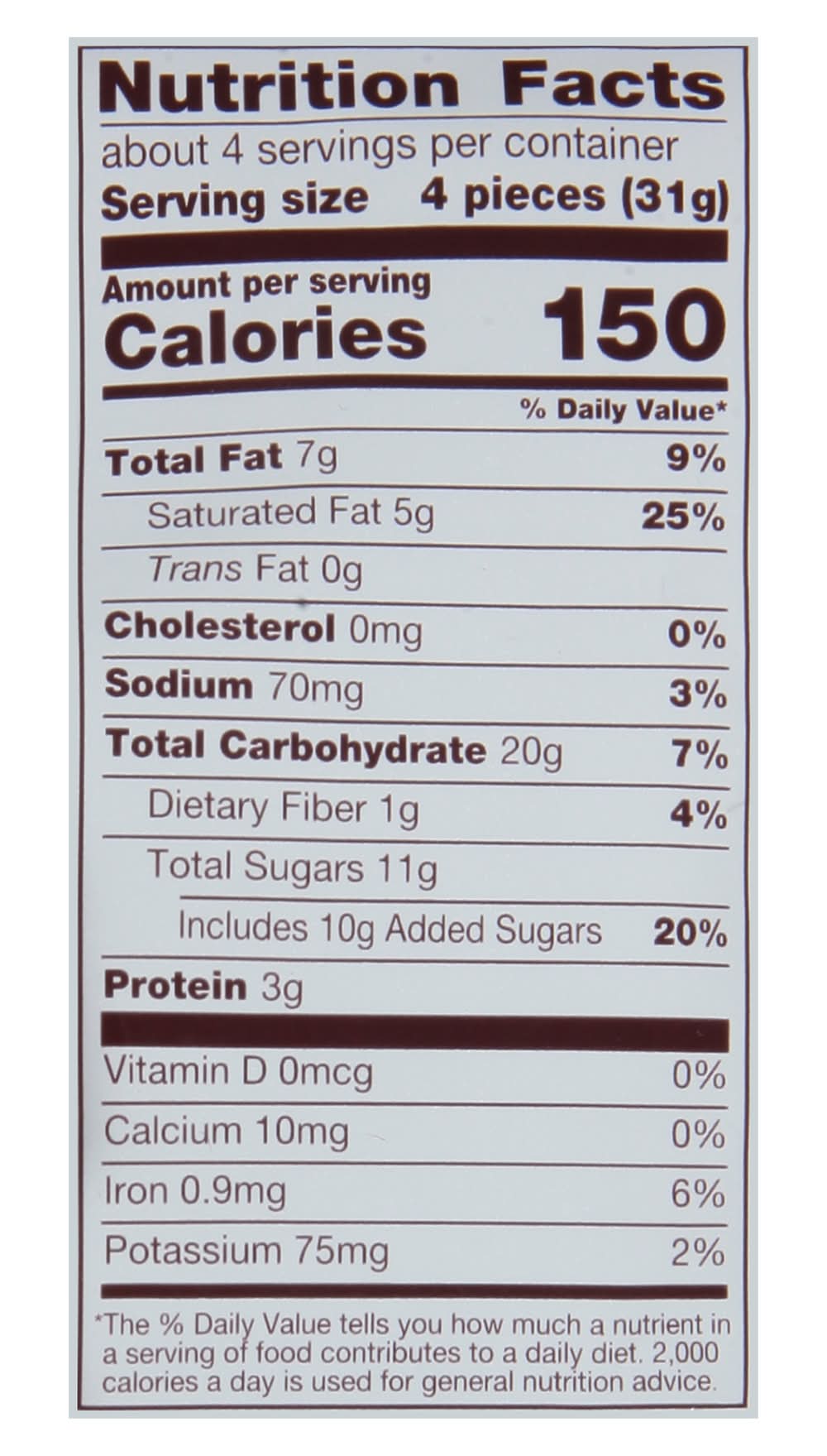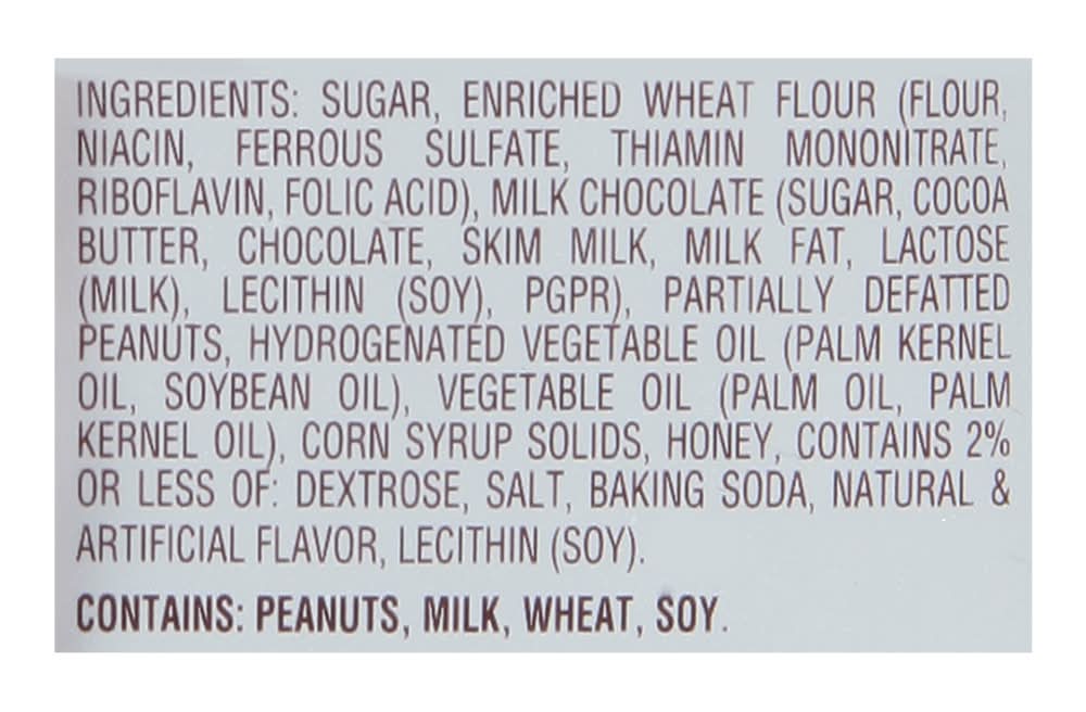 Ingredients: Sugar, Enriched Wheat Flour (Flour, Niacin, Ferrous Sulfate, Thiamin Mononitrate, Riboflavin, Folic Acid), Milk Chocolate (Sugar, Cocoa Butter, Chocolate, Skim Milk, Milk Fat, Lactose (Milk), Lecithin (Soy), PGPR), Partially Defatted Peanuts, Hydrogenated Vegetable Oil (Palm Kernel Oil, Soybean Oil), Vegetable Oil (Palm Oil, Palm Kernel Oil), Corn Syrup Solids, Honey, Contains 2% or Less of: Dextrose, Salt, Baking Soda, Natural & Artificial Flavor, Lecithin (Soy) Contains: Wheat, Milk, Lactose, Soybeans, Peanuts, Corn