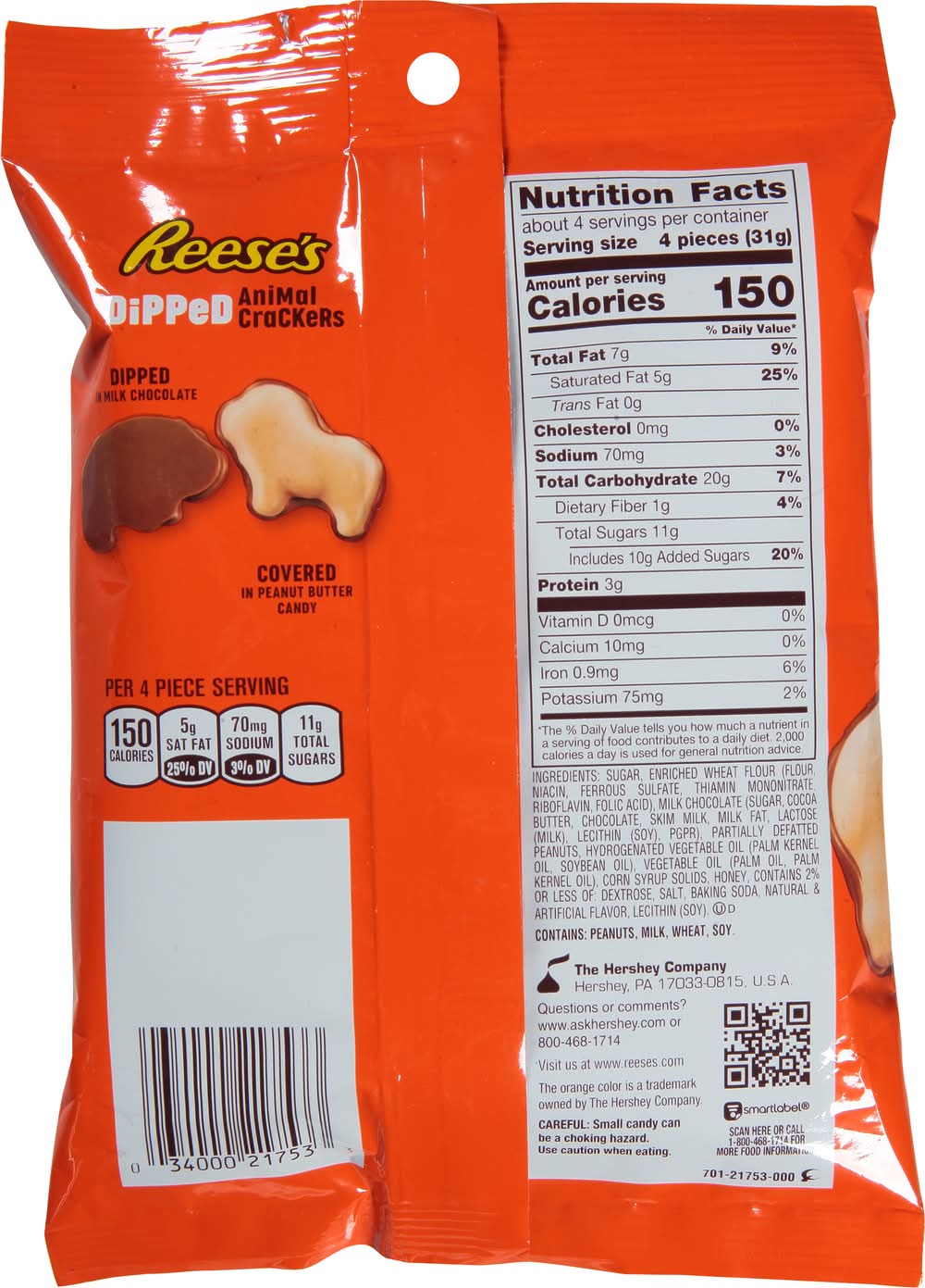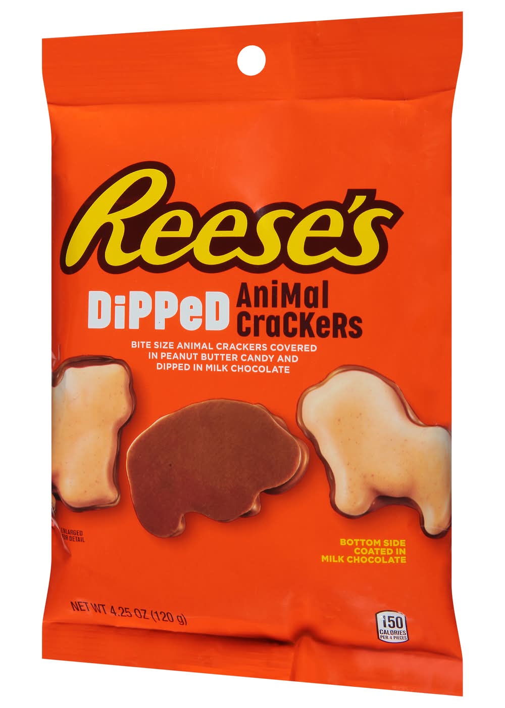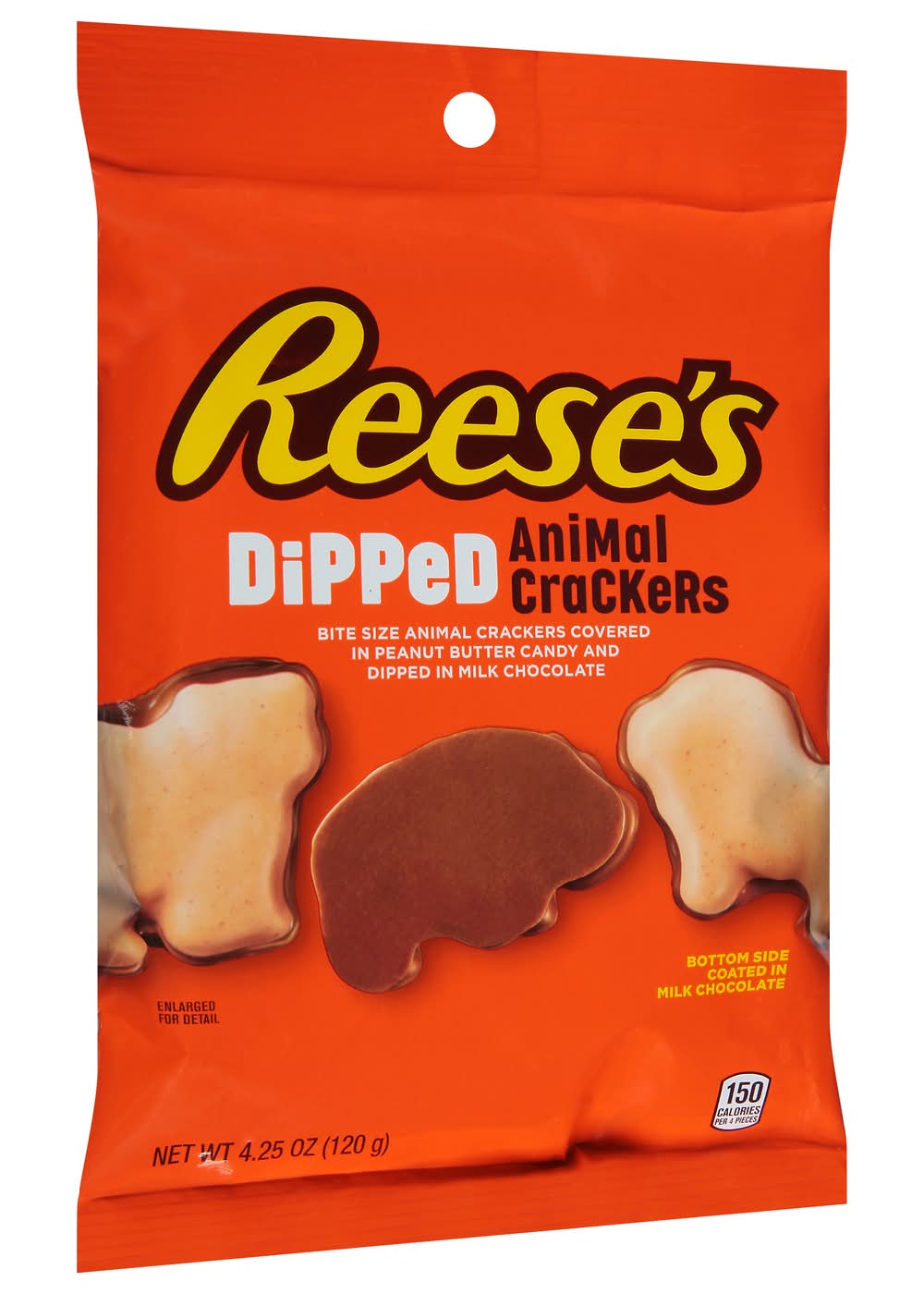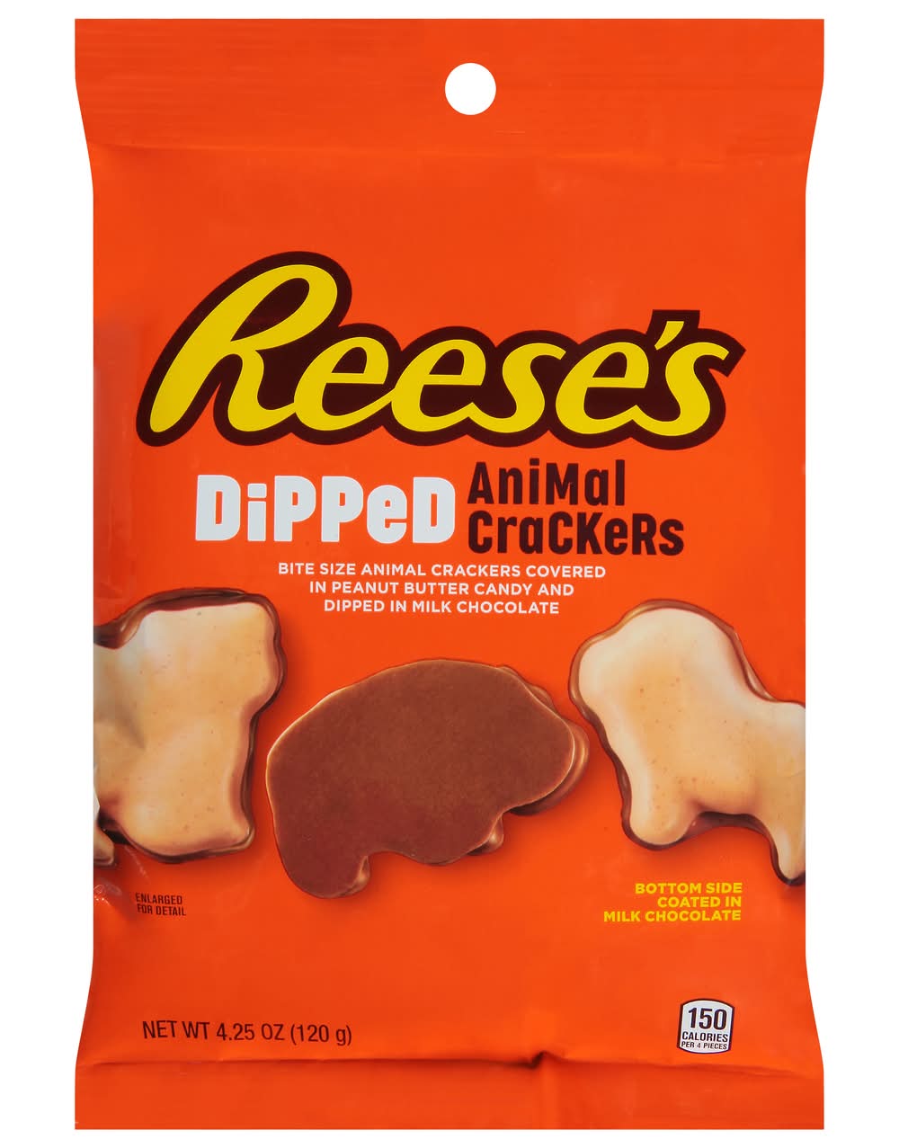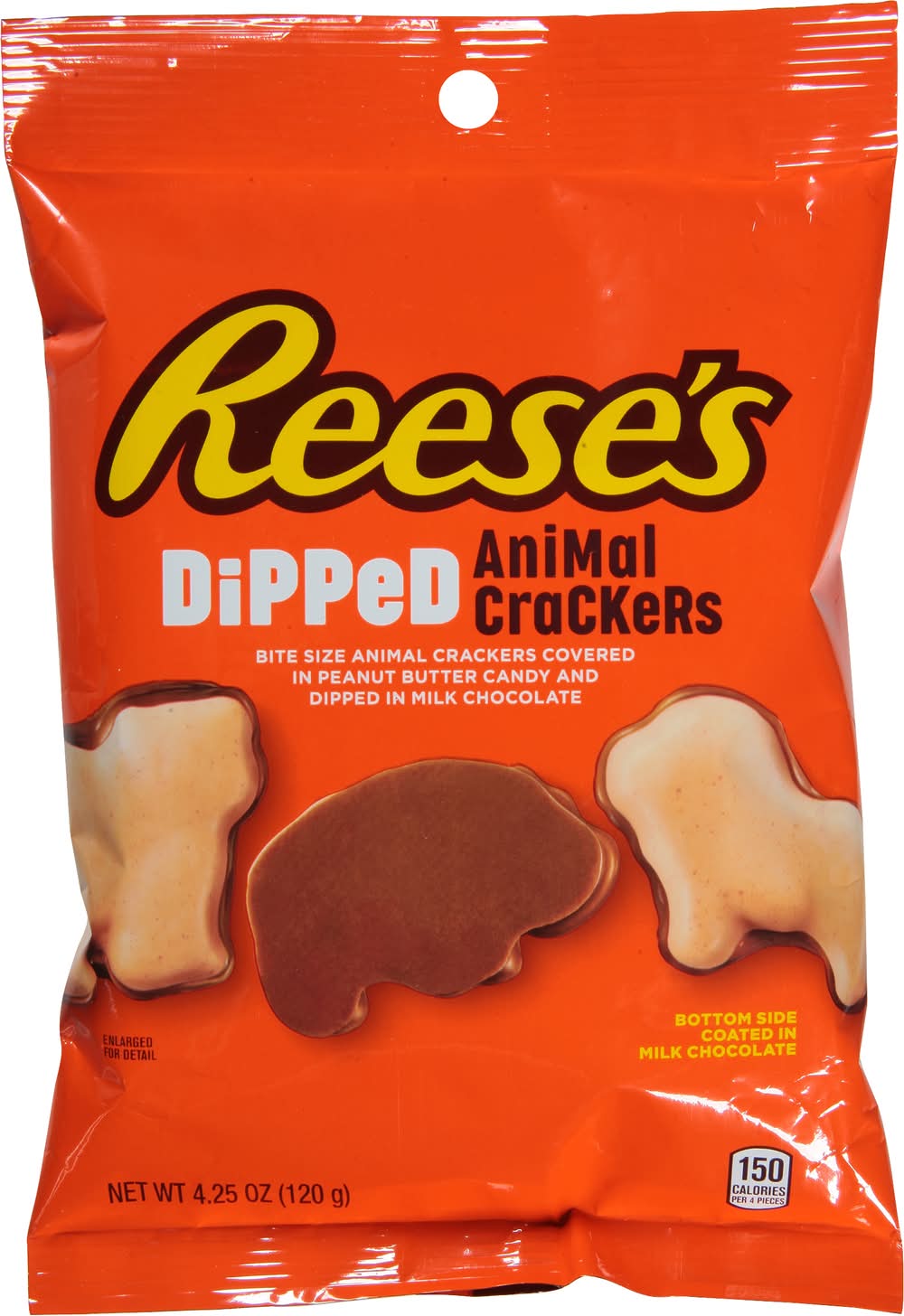 Bite Size Animal Crackers Covered in Peanut Butter Candy and Dipped in Chocolatey Candy Grab a handful of bite size animal crackers covered in peanut butter candy and dipped in smooth chocolate during your favorite TV series, while running errands or as a midday treat Certified kosher dipped animal crackers for easy snacking and sharing with your best mates Use REESE'S dipped animal crackers candy for filling birthday gift bags and school lunch boxes or bridal and baby shower candy dishes Gift REESE'S dipped animal crackers full of chocolate candy and peanut butter flavors during Christmas, Valentine's Day, Easter or Halloween celebrations Take these peanut butter candy and chocolate dipped animal crackers with you on road trips, hikes and any adventure where a bite of sweet REESE'S treats is a must Covered in a thick layer of peanut butter candy and half dipped in chocolate, these REESE'S dipped animal crackers seem too good to be true! With the bottom side of each cracker coated in chocolate candy, these peanut butter candy treats are the perfect combination of sweet chocolate, creamy peanut butter candy and crunchy animal crackers to indulge your taste buds. Pack a bag in your purse or backpack, store some in your pantry or fill your favorite covered candy jar to the brim with REESE'S candy. These bite size animal crackers are perfect to snack on no matter what you get up to, whether you enjoy unwinding in front of your favorite TV show or exploring the great outdoors.