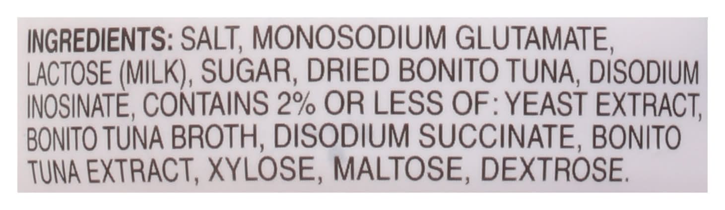 Ingredients: Salt, Monosodium Glutamate, Lactose (Milk), Sugar, Dried Bonito Tuna, Disodium Inosinate, Contains 2% or Less of: Yeast Extract, Bonito Tuna Broth, Disodium Succinate, Bonito Tuna Extract, Xylose, Maltose, Dextrose Contains: Lactose, Milk, Fish, Bonito, Fish, Tuna